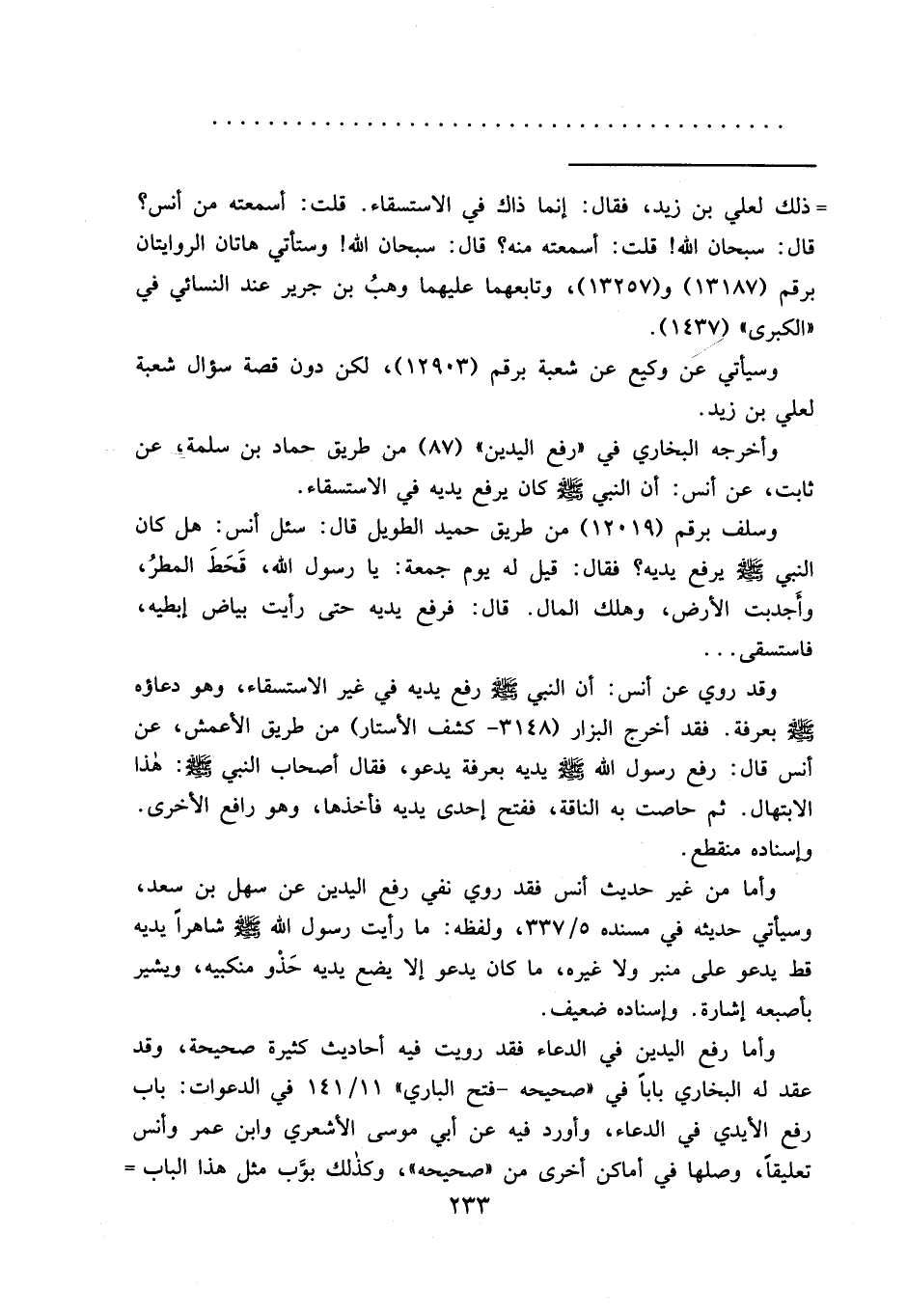 وقد روي عن أنس: أن النبي صَلَّى اللهُ عَلَيْهِ وَسَلَّمَ رفع يديه في غير الاستسقاء، وهو دعاؤه صَلَّى اللهُ عَلَيْهِ وَسَلَّمَ بعرفة. فقد أخرج البزار (٣١٤٨- كشف الأستار) من طريق الأعمش، عن أنس قال: رفع رسول الله صَلَّى اللهُ عَلَيْهِ وَسَلَّمَ يديه بعرفة يدعو، فقال أصحاب النبي صَلَّى اللهُ عَلَيْهِ وَسَلَّمَ: هذا الابتهال. ثم حاصت به الناقة، ففتح إحدى يديه فأخذها، وهو رافع الأخرى.