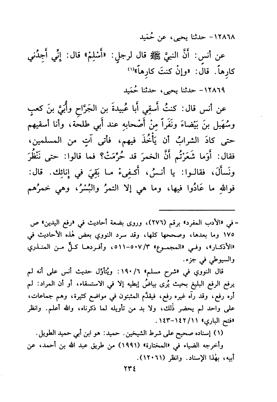 ١٢٨٦٩ - حَدَّثَنَا يَحْيَى، حَدَّثَنَا حُمَيْدٌ، عَنْ أَنَسٍ قَالَ: " كُنْتُ أَسْقِي أَبَا عُبَيْدَةَ بْنَ الْجَرَّاحِ، وَأُبَيَّ بْنَ كَعْبٍ، وَسُهَيْلَ ابْنَ بَيْضَاءَ وَنَفَرًا مِنْ أَصْحَابِهِ عِنْدَ أَبِي طَلْحَةَ، وَأَنَا أَسْقِيهِمْ، حَتَّى كَادَ الشَّرَابُ أَنْ يَأْخُذَ فِيهِمْ، فَأَتَى آتٍ مِنَ الْمُسْلِمِينَ، فَقَالَ: أَوَمَا شَعَرْتُمْ أَنَّ الْخَمْرَ قَدْ حُرِّمَتْ "، فَمَا قَالُوا: حَتَّى نَنْظُرَ وَنَسْأَلَ. فَقَالُوا: يَا أَنَسُ، أَكْفِئْ مَا بَقِيَ فِي إِنَائِكَ، قَالَ: " فَوَاللهِ مَا عَادُوا فِيهَا، وَمَا هِيَ إِلَّا التَّمْرُ وَالْبُسْرُ، وَهِيَ خَمْرُهُمْ