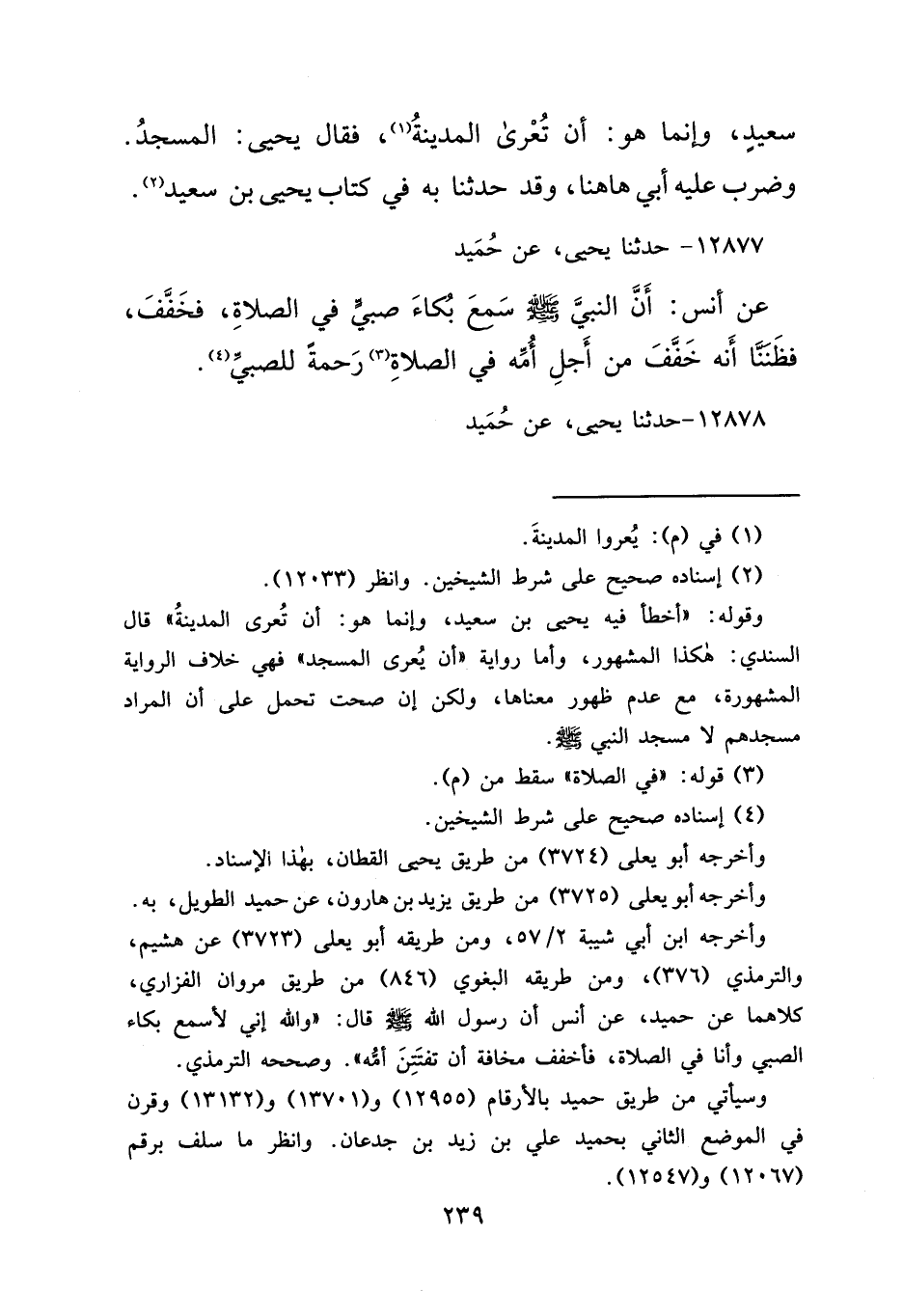 ١٢٨٧٧ - حَدَّثَنَا يَحْيَى، عَنْ حُمَيْدٍ، عَنْ أَنَسٍ، " أَنَّ النَّبِيَّ صَلَّى اللهُ عَلَيْهِ وَسَلَّمَ سَمِعَ بُكَاءَ صَبِيٍّ فِي الصَّلَاةِ، فَخَفَّفَ "، فَظَنَنَّا أَنَّهُ خَفَّفَ مِنْ أَجْلِ أُمِّهِ فِي الصَّلَاةِ (٣) رَحْمَةً لِلصَّبِيِّ (٤)