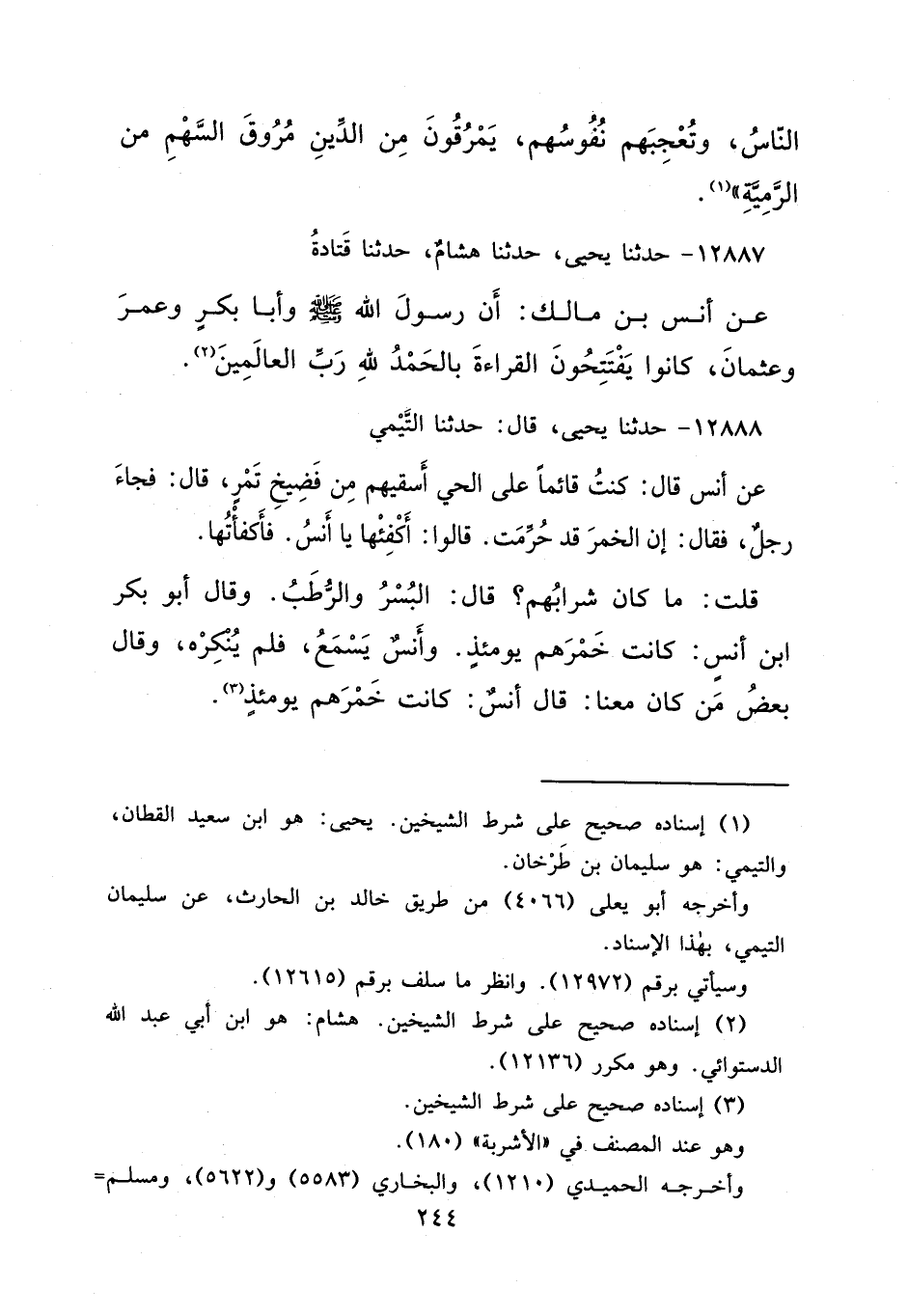 ١٢٨٨٨ - حَدَّثَنَا يَحْيَى، قَالَ: حَدَّثَنَا التَّيْمِيُّ، عَنْ أَنَسٍ، قَالَ: " كُنْتُ قَائِمًا عَلَى الْحَيِّ أَسْقِيهِمْ مِنْ فَضِيخِ تَمْرٍ، قَالَ: فَجَاءَ رَجُلٌ فَقَالَ: إِنَّ الْخَمْرَ قَدْ حُرِّمَتْ ". قَالُوا: أَكْفِئْهَا يَا أَنَسُ، فَأَكْفَأْتُهَا، قُلْتُ: مَا كَانَ شَرَابُهُمْ؟ قَالَ: " الْبُسْرُ وَالرُّطَبُ "، وقَالَ أَبُو بَكْرِ بْنُ أَنَسٍ: " كَانَتْ خَمْرَهُمْ يَوْمَئِذٍ "، وَأَنَسٌ يَسْمَعُ فَلَمْ يُنْكِرْهُ، وقَالَ بَعْضُ مَنْ كَانَ مَعَنَا، قَالَ أَنَسٌ: " كَانَتْ خَمْرَهُمْ يَوْمَئِذٍ " (٣)