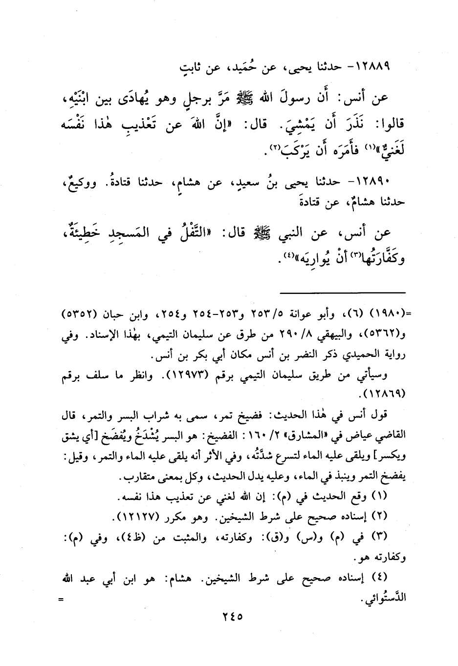١٢٨٩٠ - حَدَّثَنَا يَحْيَى بْنُ سَعِيدٍ، عَنْ هِشَامٍ، حَدَّثَنَا قَتَادَةُ، وَوَكِيعٌ، حَدَّثَنَا هِشَامٌ، عَنْ قَتَادَةَ، عَنْ أَنَسٍ، عَنِ النَّبِيِّ صَلَّى اللهُ عَلَيْهِ وَسَلَّمَ قَالَ: " التَّفْلُ فِي الْمَسْجِدِ خَطِيئَةٌ، وَكَفَّارَتُهَا (٣) أَنْ يُوَارِيَهُ " (٤)