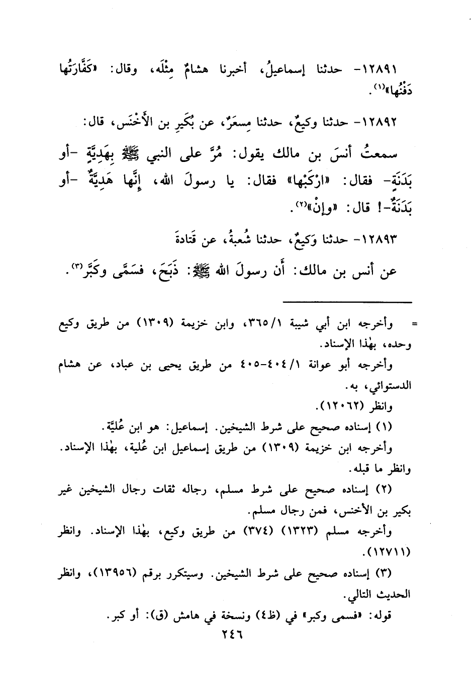 ١٢٨٩٣ - حَدَّثَنَا وَكِيعٌ، حَدَّثَنَا شُعْبَةُ، عَنْ قَتَادَةَ، عَنْ أَنَسِ بْنِ مَالِكٍ، " أَنَّ رَسُولَ اللهِ صَلَّى اللهُ عَلَيْهِ وَسَلَّمَ ذَبَحَ، فَسَمَّى وَكَبَّرَ " (٣)