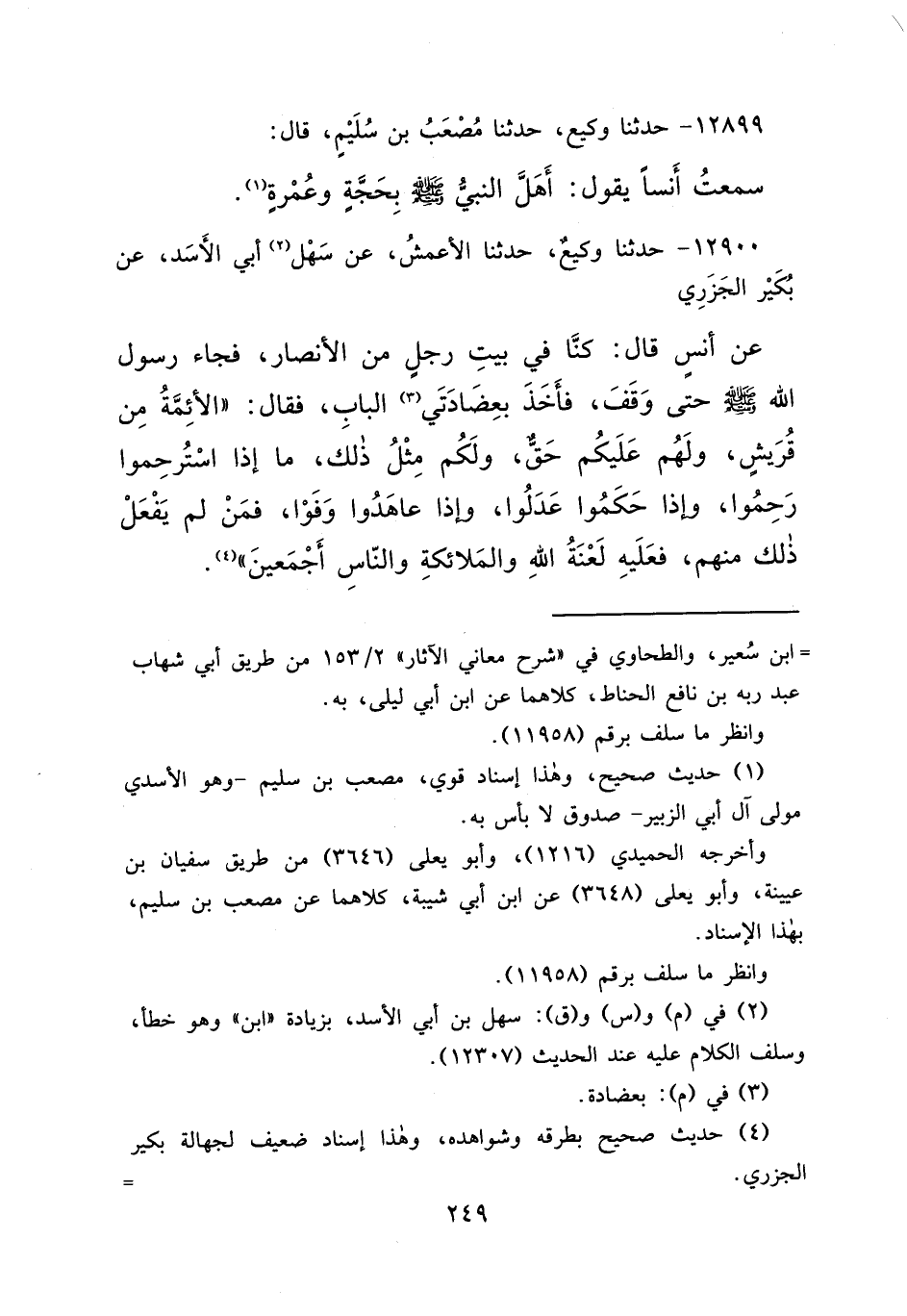 ١٢٩٠٠ - حَدَّثَنَا وَكِيعٌ، حَدَّثَنَا الْأَعْمَشُ، عَنْ سَهْلِ (٢) أَبِي الْأَسَدِ، عَنْ بُكَيْرٍ الْجَزَرِيِّ، عَنْ أَنَسٍ قَالَ: كُنَّا فِي بَيْتِ رَجُلٍ مِنَ الْأَنْصَارِ، فَجَاءَ رسول الله صَلَّى اللهُ عَلَيْهِ وَسَلَّمَ حَتَّى وَقَفَ فَأَخَذَ، بِعِضَادَتيِ (٣) الْبَابِ، فَقَالَ: " الْأَئِمَّةُ مِنْ قُرَيْشٍ، وَلَهُمْ عَلَيْكُمْ حَقٌّ، وَلَكُمْ مِثْلُ ذَلِكَ، مَا إِذَا اسْتُرْحِمُوا رَحِمُوا، وَإِذَا حَكَمُوا عَدَلُوا، وَإِذَا عَاهَدُوا وَفَّوْا، فَمَنْ لَمْ يَفْعَلْ ذَلِكَ مِنْهُمْ فَعَلَيْهِ لَعْنَةُ اللهِ، وَالْمَلَائِكَةِ، وَالنَّاسِ أَجْمَعِينَ " (٤)