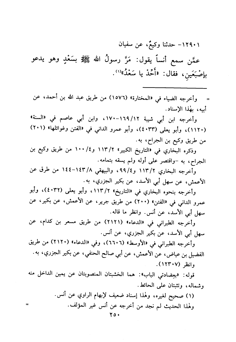١٢٩٠١ - حَدَّثَنَا وَكِيعٌ، عَنْ سُفْيَانَ، عَمَّنْ سَمِعَ أَنَسًا يَقُولُ: مَرَّ رَسُولُ اللهِ صَلَّى اللهُ عَلَيْهِ وَسَلَّمَ بِسَعْدٍ وَهُوَ يَدْعُو بِأُصْبُعَيْنِ، فَقَالَ: " أَحِّدْ يَا سَعْدُ " (١)