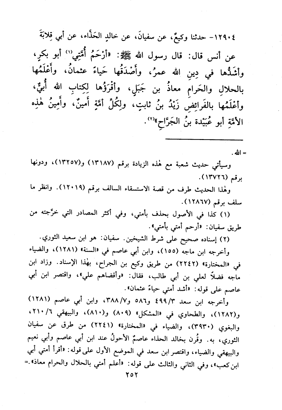 ١٢٩٠٤ - حَدَّثَنَا وَكِيعٌ، عَنْ سُفْيَانَ، عَنْ خَالِدٍ الْحَذَّاءِ، عَنْ أَبِي قِلَابَةَ، عَنْ أَنَسٍ قَالَ: قَالَ رَسُولُ اللهِ صَلَّى اللهُ عَلَيْهِ وَسَلَّمَ: " أَرْحَمُ أُمَّتِي (١) أَبُو بَكْرٍ، وَأَشَدُّهَا فِي دِينِ اللهِ عُمَرُ، وَأَصْدَقُهَا حَيَاءً عُثْمَانُ، وَأَعْلَمُهَا بِالْحَلَالِ وَالْحَرَامِ مُعَاذُ بْنُ جَبَلٍ، وَأَقْرَؤُهَا لِكِتَابِ اللهِ أُبَيٌّ، وَأَعْلَمُهَا بِالْفَرَائِضِ زَيْدُ بْنُ ثَابِتٍ، وَلِكُلِّ أُمَّةٍ أَمِينٌ، وَأَمِينُ هَذِهِ الْأُمَّةِ أَبُو عُبَيْدَةَ بْنُ الْجَرَّاحِ " (٢)
