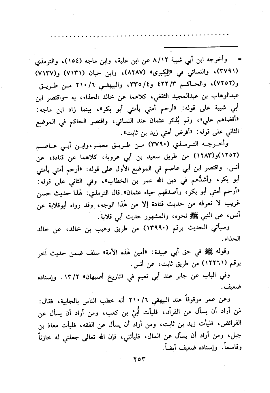 وعن عمر موقوفاً عند البيهقي ٦/٢١٠ أنه خطب الناس بالجابية، فقال: من أراد أن يسأل عن القرآن، فليأت أُبيَّ بن كعب، ومن أراد أن يسأل عن الفرائض، فليأت زيد بن ثابت، ومن أراد أن يسأل عن الفقه، فليأت معاذ بن جبل، ومن أراد أن يسأل عن المال، فليأتني، فإن الله تعالى جعلني له خازناً وقاسماً. وإسناده ضعيف أيضاً.