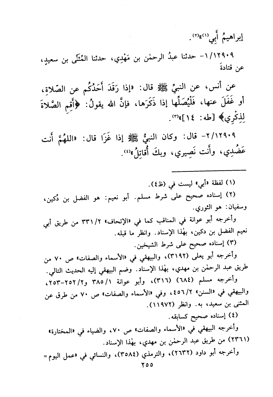 ١٢٩٠٩ - حَدَّثَنَا عَبْدُ الرَّحْمَنِ بْنُ مَهْدِيٍّ، حَدَّثَنَا الْمُثَنَّى بْنُ سَعِيدٍ، عَنْ قَتَادَةَ، عَنْ أَنَسٍ، عَنِ النَّبِيِّ صَلَّى اللهُ عَلَيْهِ وَسَلَّمَ قَالَ: " إِذَا رَقَدَ أَحَدُكُمْ عَنِ الصَّلَاةِ، أَوْ غَفَلَ عَنْهَا، فَلْيُصَلِّهَا إِذَا ذَكَرَهَا، فَإِنَّ اللهَ يَقُولُ: {أَقِمِ الصَّلَاةَ لِذِكْرِي} [طه: ١٤] " (٣)