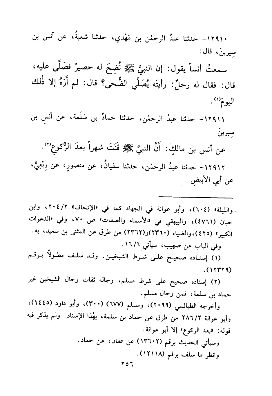 ١٢٩١١ - حَدَّثَنَا عَبْدُ الرَّحْمَنِ، حَدَّثَنَا حَمَّادُ بْنُ سَلَمَةَ، عَنْ أَنَسِ بْنِ سِيرِينَ، عَنْ أَنَسِ بْنِ مَالِكٍ، " أَنَّ النَّبِيَّ صَلَّى اللهُ عَلَيْهِ وَسَلَّمَ قَنَتَ شَهْرًا بَعْدَ الرُّكُوعِ " (٢)