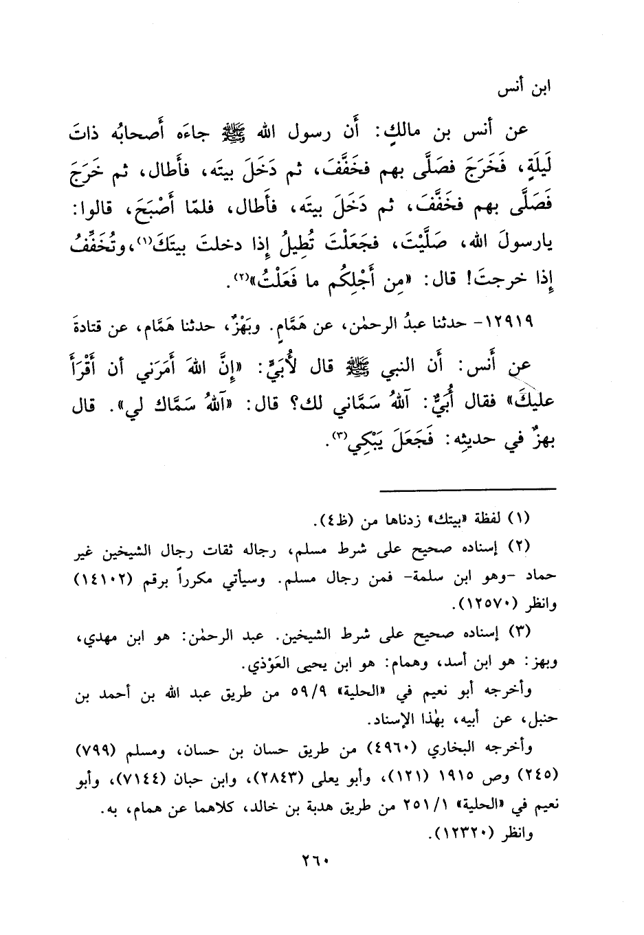 بْنِ أَنَسٍ، عَنْ أَنَسِ بْنِ مَالِكٍ، أَنَّ رَسُولَ اللهِ صَلَّى اللهُ عَلَيْهِ وَسَلَّمَ جَاءَهُ أَصْحَابُهُ ذَاتَ لَيْلَةٍ، فَخَرَجَ فَصَلَّى بِهِمْ فَخَفَّفَ، ثُمَّ دَخَلَ بَيْتَهُ، فَأَطَالَ، ثُمَّ خَرَجَ فَصَلَّى بِهِمْ فَخَفَّفَ، ثُمَّ دَخَلَ بَيْتَهُ، فَأَطَالَ، فَلَمَّا أَصْبَحَ، قَالُوا: يَا رَسُولَ اللهِ، صَلَّيْتَ، فَجَعَلْتَ تُطِيلُ إِذَا دَخَلْتَ بَيْتَكَ، (١) وَتُخَفِّفُ إِذَا خَرَجْتَ، قَالَ: " مِنْ أَجْلِكُمْ مَا فَعَلْتُ " (٢)