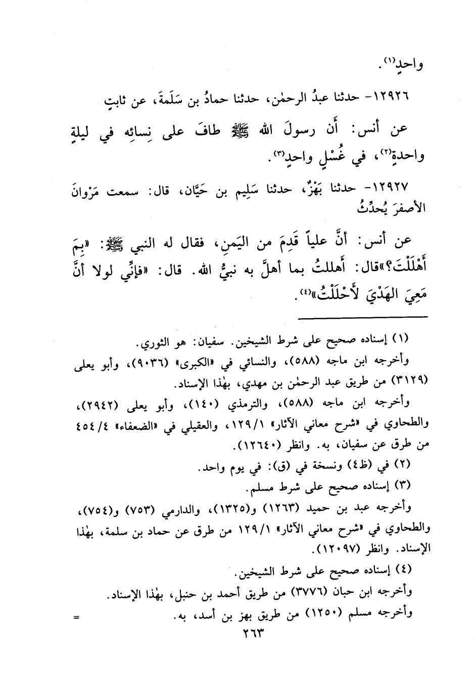 ١٢٩٢٦ - حَدَّثَنَا عَبْدُ الرَّحْمَنِ، حَدَّثَنَا حَمَّادُ بْنُ سَلَمَةَ، عَنْ ثَابِتٍ، عَنْ أَنَسٍ، " أَنَّ رَسُولَ اللهِ صَلَّى اللهُ عَلَيْهِ وَسَلَّمَ طَافَ عَلَى نِسَائِهِ فِي لَيْلَةٍ وَاحِدَةٍ، (٢) فِي غُسْلٍ وَاحِدٍ " (٣)