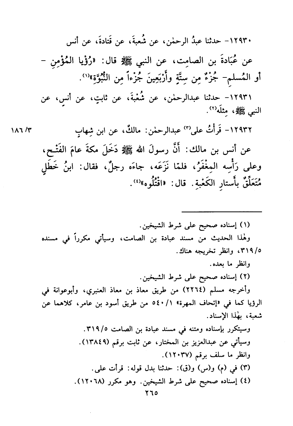 ١٢٩٣٢ - قَرَأْتُ عَلَى (٣) عَبْدُ الرَّحْمَنِ، مَالِكٌ عَنِ ابْنِ شِهَابٍ، عَنْ أَنَسِ بْنِ مَالِكٍ، أَنَّ رَسُولَ اللهِ صَلَّى اللهُ عَلَيْهِ وَسَلَّمَ دَخَلَ مَكَّةَ عَامَ الْفَتْحِ وَعَلَى رَأْسِهِ الْمِغْفَرُ فَلَمَّا نَزَعَهُ، جَاءَهُ رَجُلٌ وَقَالَ: ابْنُ خَطَلٍ مُتَعَلِّقٌ بِأَسْتَارِ الْكَعْبَةِ فَقَالَ: " اقْتُلُوهُ " (٤)