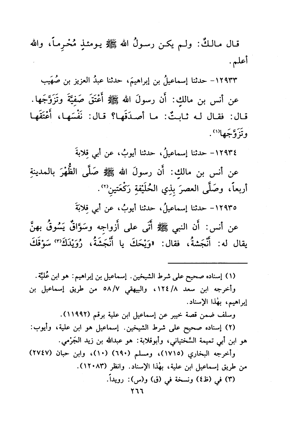 ١٢٩٣٣ - حَدَّثَنَا إِسْمَاعِيلُ بْنُ إِبْرَاهِيمَ، حَدَّثَنَا عَبْدُ الْعَزِيزِ بْنُ صُهَيْبٍ، عَنْ أَنَسِ بْنِ مَالِكٍ، " أَنَّ رَسُولَ اللهِ صَلَّى اللهُ عَلَيْهِ وَسَلَّمَ أَعْتَقَ صَفِيَّةَ وَتَزَوَّجَهَا " قَالَ: فَقَالَ لَهُ ثَابِتٌ: مَا أَصْدَقَهَا؟ قَالَ: " نَفْسَهَا أَعْتَقَهَا وَتَزَوَّجَهَا " (١)