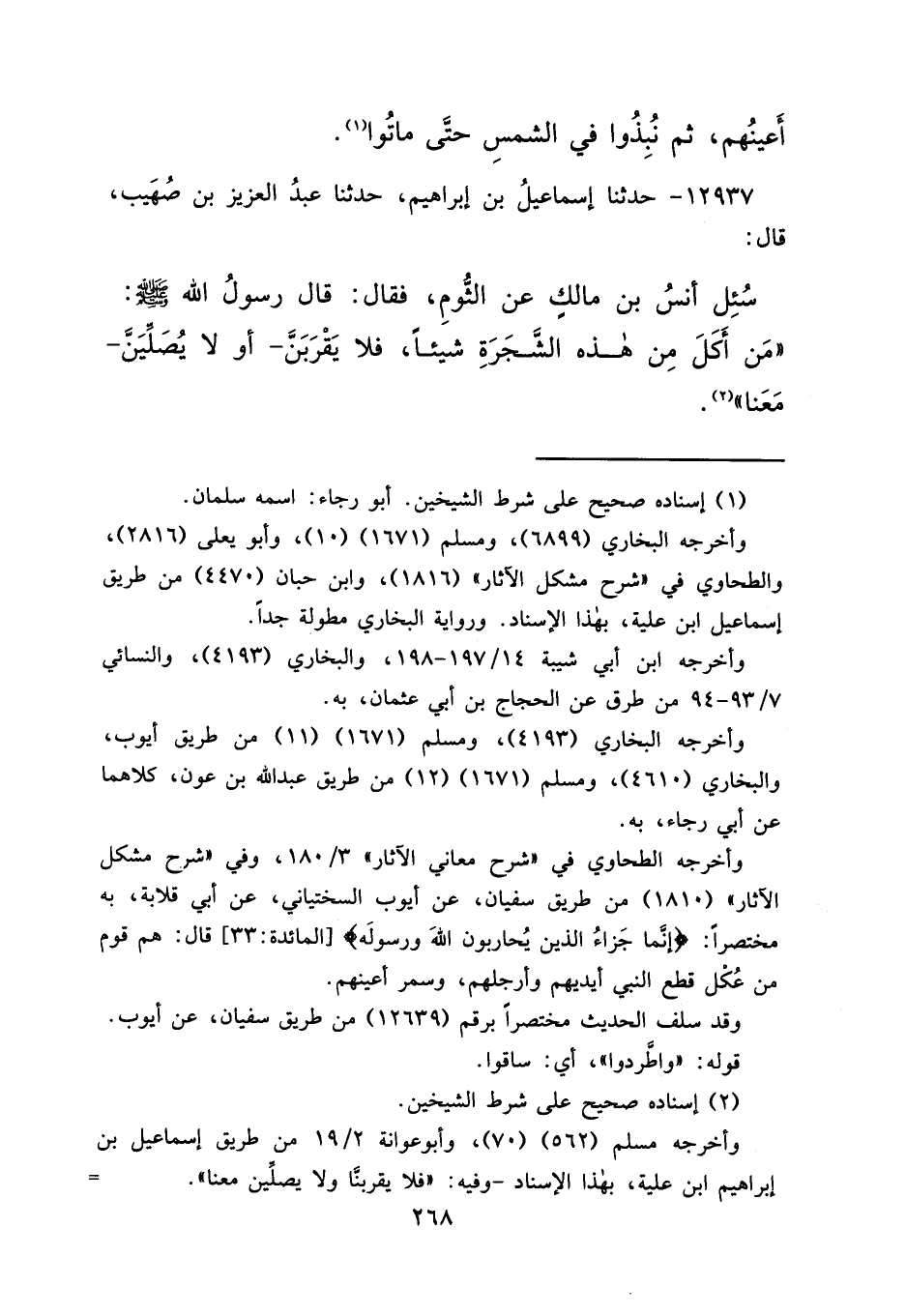 ١٢٩٣٧ - حَدَّثَنَا إِسْمَاعِيلُ بْنُ إِبْرَاهِيمَ، حَدَّثَنَا عَبْدُ الْعَزِيزِ بْنُ صُهَيْبٍ، قَالَ: سُئِلَ أَنَسُ بْنُ مَالِكٍ عَنِ الثُّومِ، فَقَالَ: قَالَ رَسُولُ اللهِ صَلَّى اللهُ عَلَيْهِ وَسَلَّمَ: " مَنْ أَكَلَ مِنْ هَذِهِ الشَّجَرَةِ شَيْئًا، فَلَا يَقْرَبَنَّ - أَوْ لَا يُصَلِّيَنَّ - مَعَنَا " (٢)