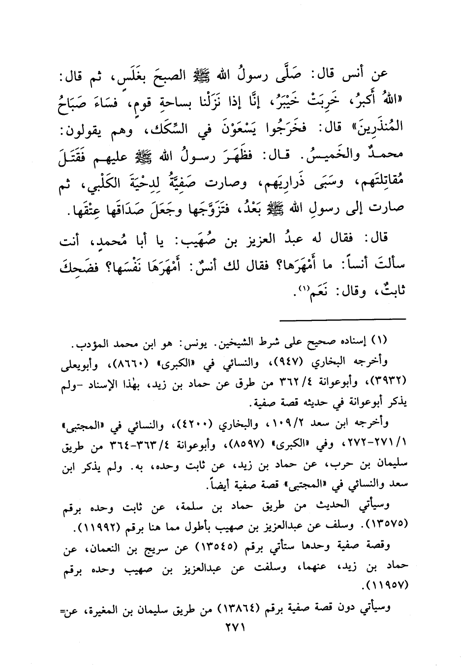 عَنْ أَنَسٍ قَالَ: صَلَّى رَسُولُ اللهِ صَلَّى اللهُ عَلَيْهِ وَسَلَّمَ الصُّبْحَ بِغَلَسٍ، ثُمَّ قَالَ: " اللهُ أَكْبَرُ، خَرِبَتْ خَيْبَرُ، إِنَّا إِذَا نَزَلْنَا بِسَاحَةِ قَوْمٍ فَسَاءَ صَبَاحُ الْمُنْذَرِينَ ". قَالَ: فَخَرَجُوا يَسْعَوْنَ فِي السِّكَكِ وَهُمْ يَقُولُونَ: مُحَمَّدٌ وَالْخَمِيسُ. قَالَ: فَظَهَرَ رَسُولُ اللهِ صَلَّى اللهُ عَلَيْهِ وَسَلَّمَ عَلَيْهِمْ فَقَتَلَ مُقَاتِلَتَهُمْ، وَسَبَى ذَرَارِيَّهُمْ، وَصَارَتْ صَفِيَّةُ لِدِحْيَةَ الْكَلْبِيِّ، ثُمَّ صَارَتْ إِلَى رَسُولِ اللهِ صَلَّى اللهُ عَلَيْهِ وَسَلَّمَ بَعْدُ، فَتَزَوَّجَهَا وَجَعَلَ صَدَاقَهَا عِتْقَهَا، قَالَ: فَقَالَ لَهُ عَبْدُ الْعَزِيزِ بْنُ صُهَيْبٍ: يَا أَبَا مُحَمَّدٍ، أَنْتَ سَأَلْتَ أَنَسًا مَا أَمْهَرَهَا؟ فَقَالَ لَكَ أَنَسٌ: " أَمْهَرَهَا نَفْسَهَا " فَضَحِكَ ثَابِتٌ وَقَالَ: نَعَمْ (١)