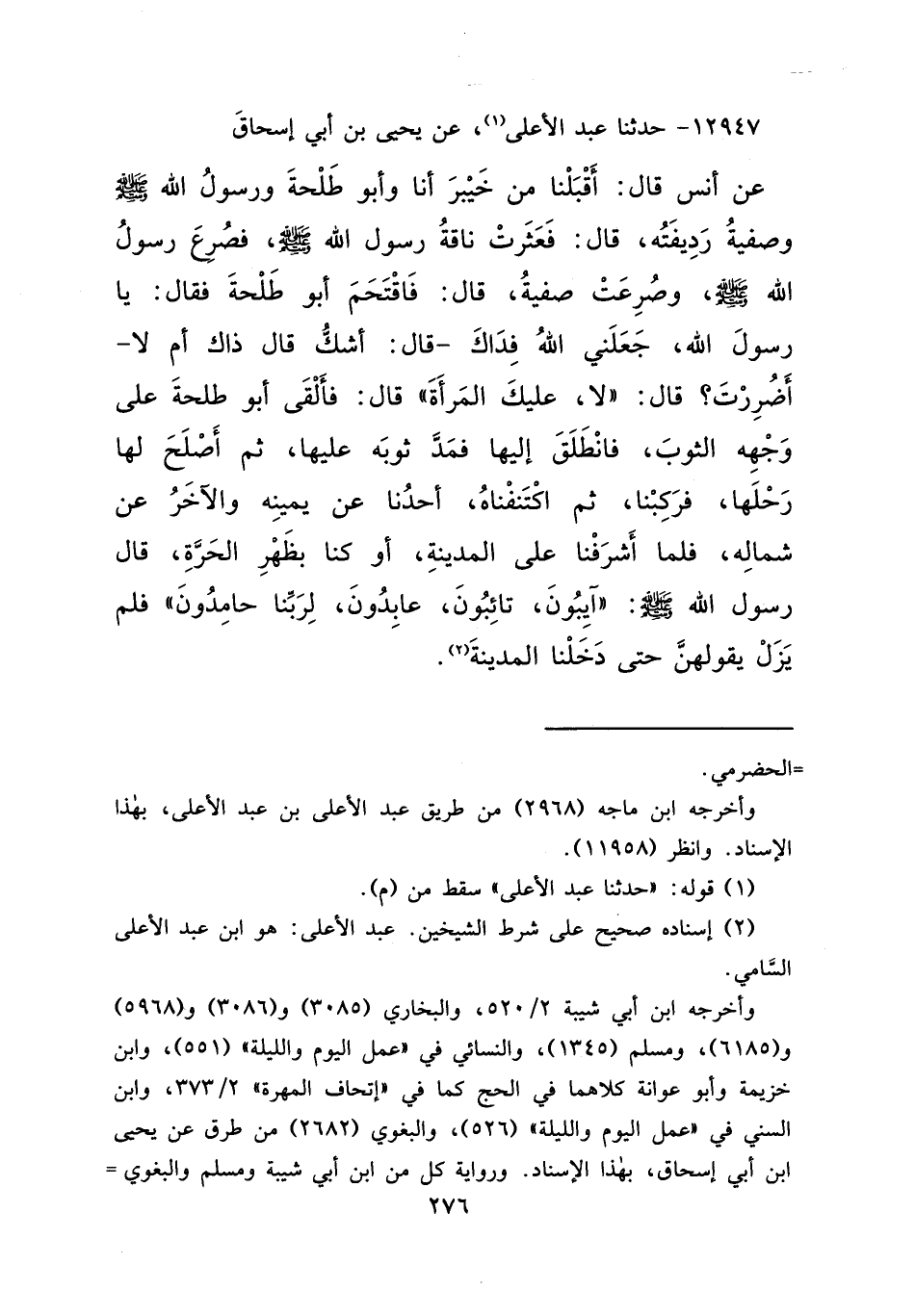 ١٢٩٤٧ - حَدَّثَنَا عَبْدُ الْأَعْلَى، (١) عَنْ يَحْيَى بْنِ أَبِي إِسْحَاقَ، عَنْ أَنَسٍ قَالَ: " أَقْبَلْنَا مِنْ خَيْبَرَ أَنَا وأَبُو طَلْحَةَ وَرَسُولُ اللهِ صَلَّى اللهُ عَلَيْهِ وَسَلَّمَ، وَصَفِيَّةُ رَدِيفَتُهُ، قَالَ: فَعَثَرَتْ نَاقَةُ رَسُولِ اللهِ صَلَّى اللهُ عَلَيْهِ وَسَلَّمَ، فَصُرِعَ رَسُولُ اللهِ صَلَّى اللهُ عَلَيْهِ وَسَلَّمَ وَصُرِعَتْ صَفِيَّةُ. قَالَ: فَاقْتَحَمَ أَبُو طَلْحَةَ فَقَالَ: يَا رَسُولَ اللهِ، جَعَلَنِي اللهُ فِدَاكَ، - قَالَ: أَشُكُّ قَالَ ذَاكَ أَمْ لَا - أَضُرِرْتَ؟ قَالَ: " لَا، عَلَيْكَ الْمَرْأَةَ " قَالَ: فَأَلْقَى أَبُو طَلْحَةَ عَلَى وَجْهِهِ الثَّوْبَ، فَانْطَلَقَ إِلَيْهَا فَمَدَّ ثَوْبَهُ عَلَيْهَا، ثُمَّ أَصْلَحَ لَهَا رَحْلَهَا، فَرَكِبْنَا، ثُمَّ اكْتَنَفْنَاهُ، أَحَدُنَا عَنْ يَمِينِهِ وَالْآخَرُ عَنْ شِمَالِهِ، فَلَمَّا أَشْرَفْنَا عَلَى الْمَدِينَةِ، أَوْ كُنَّا بِظَهْرِ الْحَرَّةِ، قَالَ رَسُولُ اللهِ صَلَّى اللهُ عَلَيْهِ وَسَلَّمَ: " آيِبُونَ، تَائِبُونَ عَابِدُونَ، لِرَبِّنَا حَامِدُونَ " فَلَمْ يَزَلْ يَقُولُهُنَّ حَتَّى دَخَلْنَا الْمَدِينَةَ (٢)