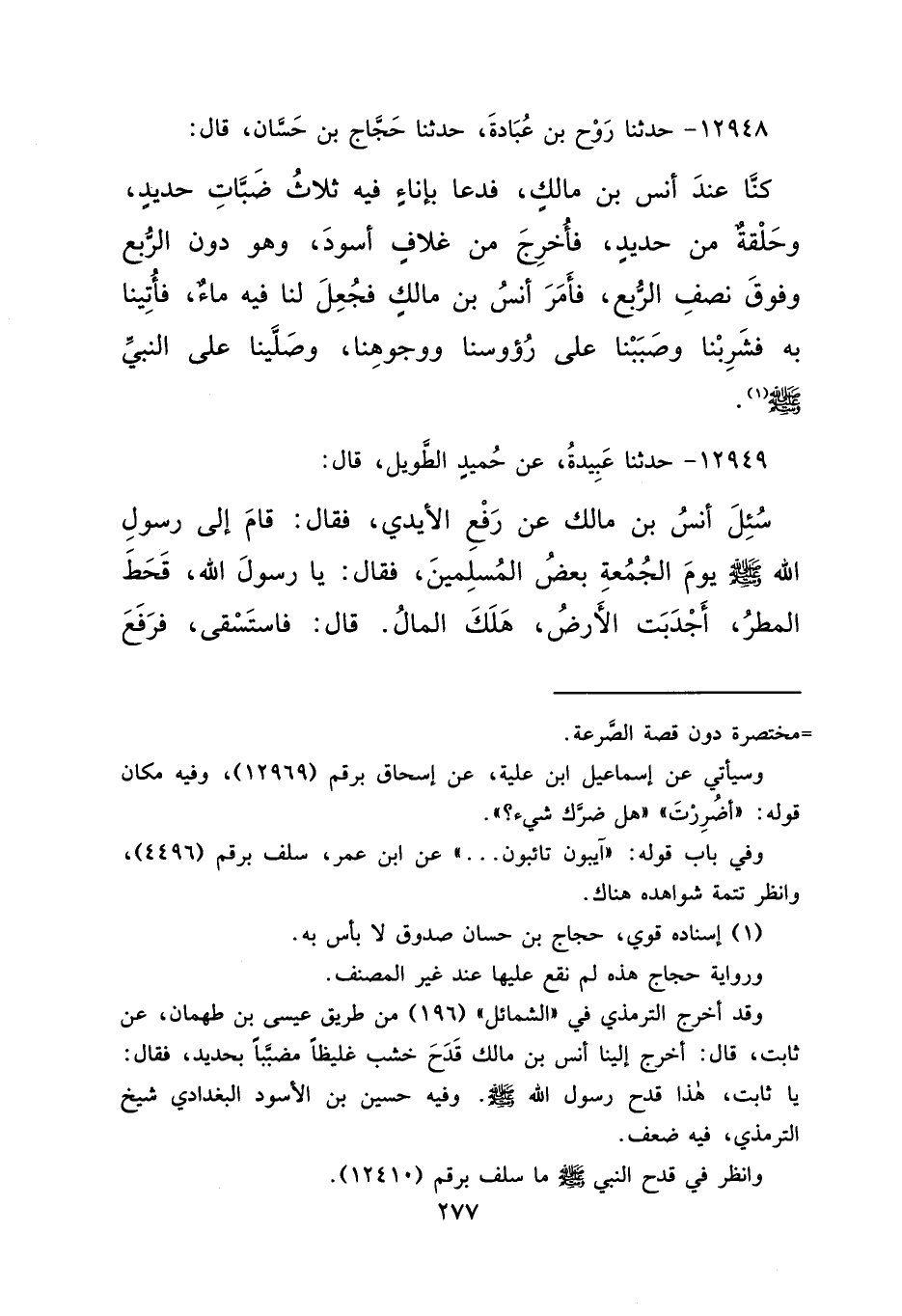 ١٢٩٤٨ - حَدَّثَنَا رَوْحُ بْنُ عُبَادَةَ، حَدَّثَنَا حَجَّاجُ بْنُ حَسَّانَ، قَالَ: كُنَّا عِنْدَ أَنَسِ بْنِ مَالِكٍ، " فَدَعَا بِإِنَاءٍ وَفِيهِ ثَلَاثُ ضِبَابٍ حَدِيدٍ، وَحَلْقَةٌ مِنْ حَدِيدٍ، فَأُخْرِجَ مِنْ غِلَافٍ أَسْوَدَ، وَهُوَ دُونَ الرُّبُعِ وَفَوْقَ نِصْفِ الرُّبُعِ، " فَأَمَرَ أَنَسُ بْنُ مَالِكٍ فَجُعِلَ لَنَا فِيهِ مَاءٌ، فَأُتِينَا بِهِ فَشَرِبْنَا وَصَبَبْنَا عَلَى رُءُوسِنَا وَوُجُوهِنَا، وَصَلَّيْنَا عَلَى النَّبِيِّ صَلَّى اللهُ عَلَيْهِ وَسَلَّمَ " (١)