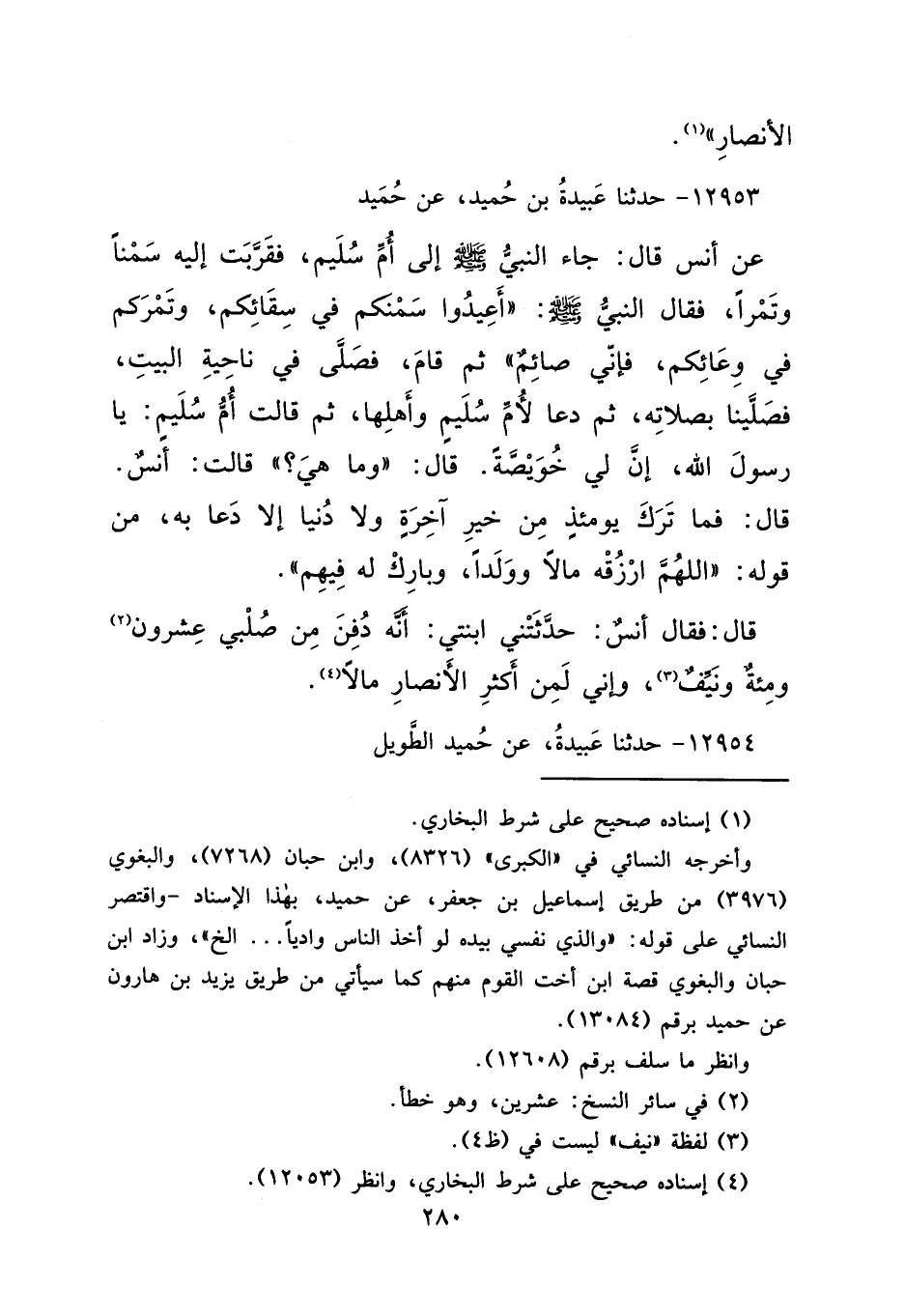 ١٢٩٥٣ - حَدَّثَنَا عَبِيدَةُ بْنُ حُمَيْدٍ، عَنْ حُمَيْدٍ، عَنْ أَنَسٍ قَالَ: جَاءَ النَّبِيُّ صَلَّى اللهُ عَلَيْهِ وَسَلَّمَ إِلَى أُمِّ سُلَيْمٍ، فَقَرَّبَتْ إِلَيْهِ سَمْنًا وَتَمْرًا، فَقَالَ النَّبِيُّ صَلَّى اللهُ عَلَيْهِ وَسَلَّمَ: " أَعِيدُوا سَمْنَكُمْ فِي سِقَائِكُمْ، وَتَمْرَكُمْ فِي وِعَائِكُمْ، فَإِنِّي صَائِمٌ ". ثُمَّ قَامَ فَصَلَّى فِي نَاحِيَةِ الْبَيْتِ، فَصَلَّيْنَا بِصَلَاتِهِ، ثُمَّ دَعَا لِأُمِّ سُلَيْمٍ وَأَهْلِهَا، ثُمَّ قَالَتْ أُمُّ سُلَيْمٍ: يَا رَسُولَ اللهِ، إِنَّ لِي خُوَيْصَّةً، قَالَ: " وَمَا هِيَ؟ " قَالَتْ: أَنَسٌ قَالَ: فَمَا تَرَكَ يَوْمَئِذٍ مِنْ خَيْرِ آخِرَةٍ وَلَا دُنْيَا، إِلَّا دَعَا بِهِ مِنْ قَوْلِهِ: " اللهُمَّ ارْزُقْهُ مَالًا وَوَلَدًا، وَبَارِكْ لَهُ فِيهِمْ "، قَالَ: فَقَالَ أَنَسٌ: " حَدَّثَتْنِي ابْنَتِي أَنَّهُ دُفِنَ مِنْ صُلْبِي عِشْرُونَ (٢) وَمِائَةٌ وَنَيِّفٌ، (٣) وَإِنِّي لَمِنْ أَكْثَرِ الْأَنْصَارِ مَالًا " (٤)