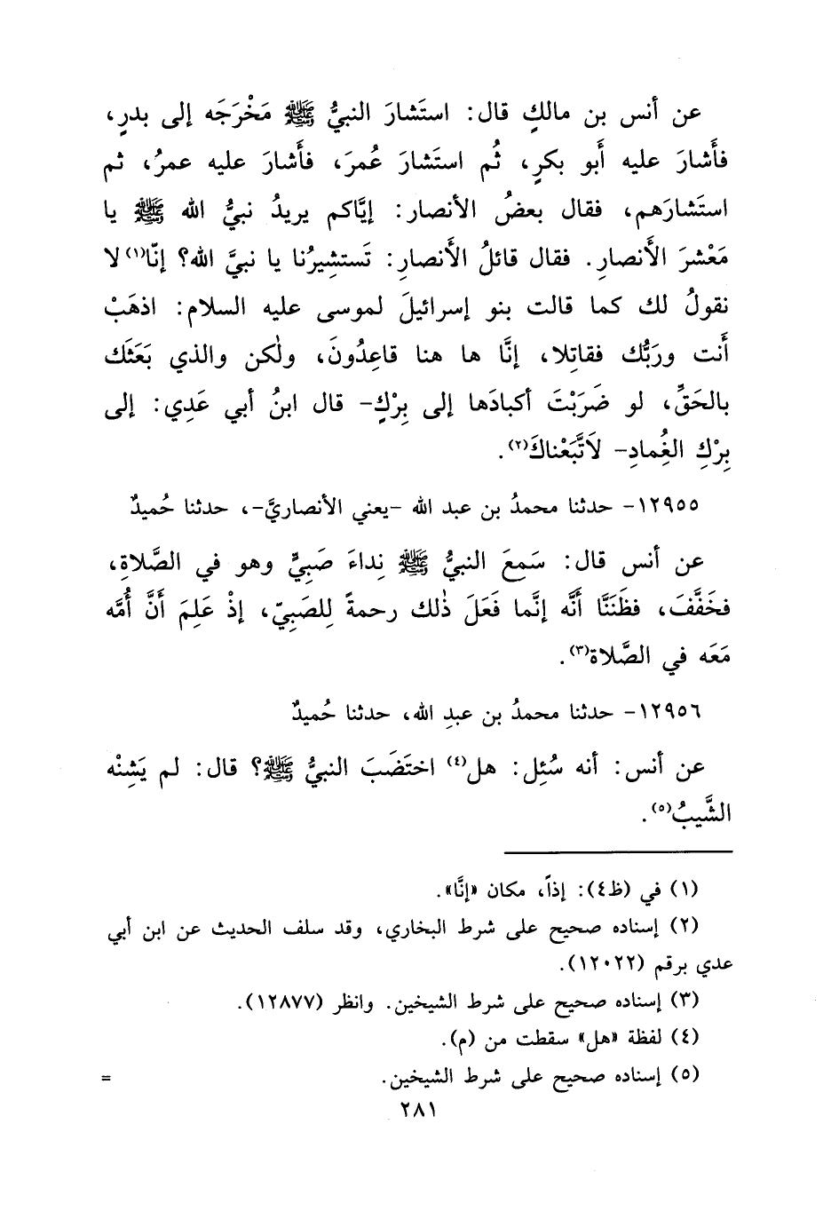 عَنْ أَنَسِ بْنِ مَالِكٍ، قَالَ: " اسْتَشَارَ النَّبِيُّ صَلَّى اللهُ عَلَيْهِ وَسَلَّمَ مَخْرَجَهُ إِلَى بَدْرٍ "، فَأَشَارَ عَلَيْهِ أَبُو بَكْرٍ، ثُمَّ اسْتَشَارَ عُمَرَ، فَأَشَارَ عَلَيْهِ عُمَرُ، ثُمَّ اسْتَشَارَهُمْ فَقَالَ بَعْضُ الْأَنْصَارِ: إِيَّاكُمْ يُرِيدُ نَبِيُّ اللهِ صَلَّى اللهُ عَلَيْهِ وَسَلَّمَ يَا مَعْشَرَ الْأَنْصَارِ، فَقَالَ قَائِلُ الْأَنْصَارِ: تَسْتَشِيرُنَا يَا نَبِيَّ اللهِ، إِنَّا (١) لَا نَقُولُ لَكَ كَمَا قَالَتْ بَنُو إِسْرَائِيلَ لِمُوسَى عَلَيْهِ السَّلَامُ: اذْهَبْ أَنْتَ وَرَبُّكَ فَقَاتِلَا، إِنَّا هَاهُنَا قَاعِدُونَ، وَلَكِنْ وَالَّذِي بَعَثَكَ بِالْحَقِّ، لَوْ ضَرَبْتَ أَكْبَادَهَا إِلَى بَرْكٍ، - قَالَ ابْنُ أَبِي عَدِيٍّ: إِلَى بَرْكِ الْغِمَادِ - لَاتَّبَعْنَاكَ (٢)