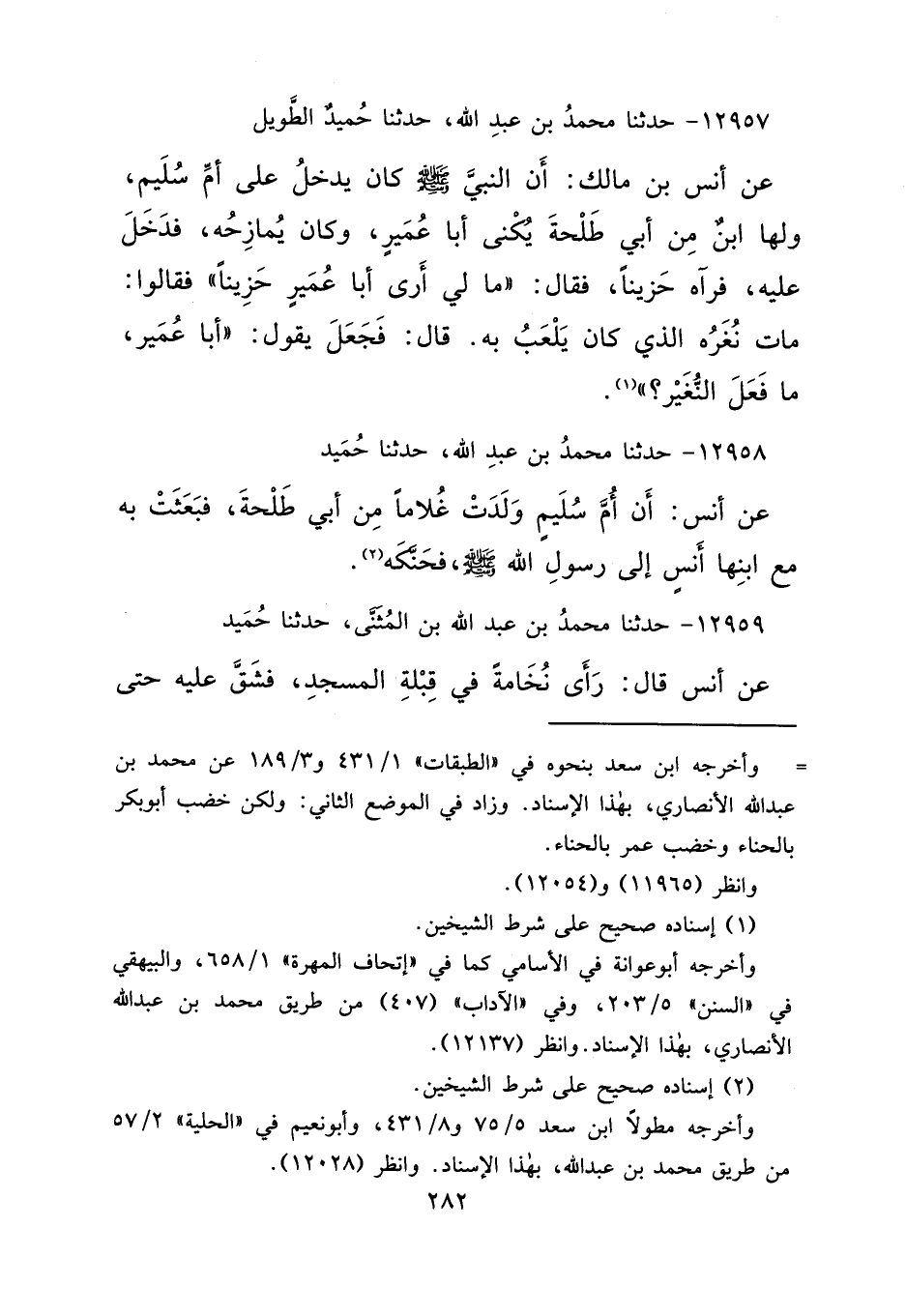 ١٢٩٥٨ - حَدَّثَنَا مُحَمَّدُ بْنُ عَبْدِ اللهِ، حَدَّثَنَا حُمَيْدٌ، عَنْ أَنَسٍ، أَنَّ أُمَّ سُلَيْمٍ وَلَدَتْ غُلَامًا مِنْ أَبِي طَلْحَةَ، فَبَعَثَتْ بِهِ مَعَ ابْنِهَا أَنَسٍ إِلَى رَسُولِ اللهِ صَلَّى اللهُ عَلَيْهِ وَسَلَّمَ، " فَحَنَّكَهُ " (٢)