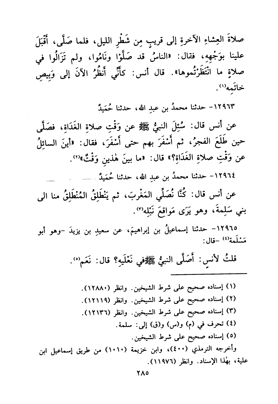 ١٢٩٦٥ - حَدَّثَنَا إِسْمَاعِيلُ بْنُ إِبْرَاهِيمَ، عَنْ سَعِيدِ بْنِ يَزِيدَ وَهُوَ أَبُو سَلَمَةَ (٤) قَالَ: قُلْتُ لِأَنَسٍ: أَصَلَّى النَّبِيُّ صَلَّى اللهُ عَلَيْهِ وَسَلَّمَ فِي نَعْلَيْهِ؟ قَالَ: " نَعَمْ " (٥)