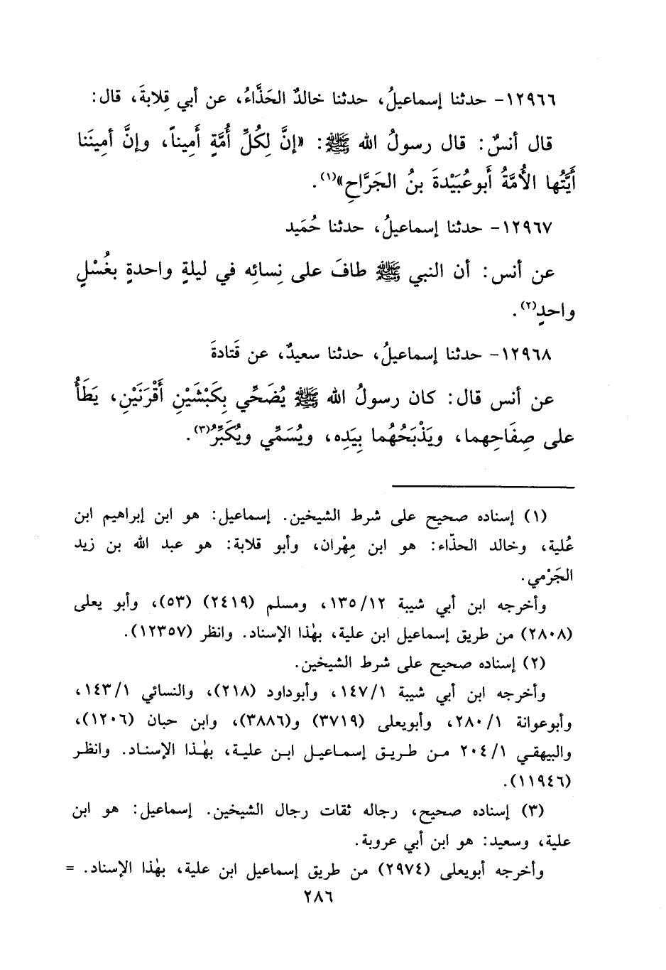 ١٢٩٦٨ - حَدَّثَنَا إِسْمَاعِيلُ، حَدَّثَنَا سَعِيدٌ، عَنْ قَتَادَةَ، عَنْ أَنَسٍ قَالَ: " كَانَ رَسُولُ اللهِ صَلَّى اللهُ عَلَيْهِ وَسَلَّمَ يُضَحِّي بِكَبْشَيْنِ أَقْرَنَيْنِ، يَطَأُ عَلَى صِفَاحِهِمَا، وَيَذْبَحُهُمَا بِيَدِهِ، وَيُسَمِّي وَيُكَبِّرُ " (٣)