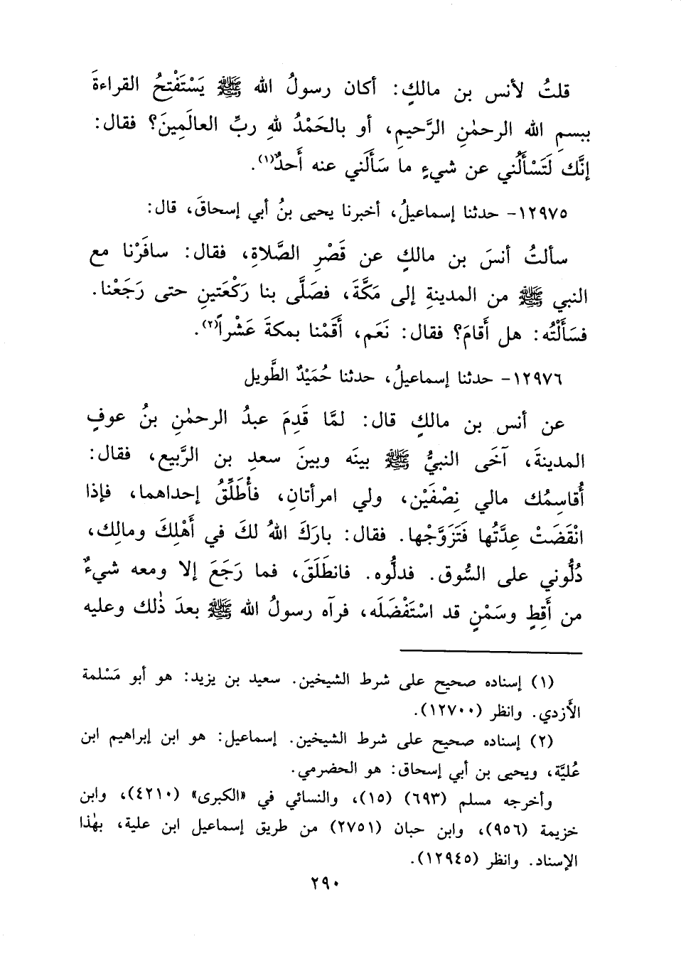 ١٢٩٧٦ - حَدَّثَنَا إِسْمَاعِيلُ، حَدَّثَنَا حُمَيْدٌ الطَّوِيلُ، عَنْ أَنَسِ بْنِ مَالِكٍ، قَالَ: لَمَّا قَدِمَ عَبْدُ الرَّحْمَنِ بْنُ عَوْفٍ الْمَدِينَةَ، آخَى النَّبِيُّ صَلَّى اللهُ عَلَيْهِ وَسَلَّمَ بَيْنَهُ وَبَيْنَ سَعْدِ بْنِ الرَّبِيعِ، فَقَالَ: أُقَاسِمُكَ مَالِي نِصْفَيْنِ، وَلِي امْرَأَتَانِ فَأُطَلِّقُ إِحْدَاهُمَا، فَإِذَا انْقَضَتْ عِدَّتُهَا فَتَزَوَّجْهَا فَقَالَ: بَارَكَ اللهُ لَكَ فِي أَهْلِكَ وَمَالِكَ، دُلُّونِي عَلَى السُّوقِ؟ فَدَلُّوهُ، فَانْطَلَقَ، فَمَا رَجَعَ إِلَّا وَمَعَهُ شَيْءٌ مِنْ أَقِطٍ وَسَمْنٍ قَدِ اسْتَفْضَلَهُ، فَرَآهُ رَسُولُ اللهِ صَلَّى اللهُ عَلَيْهِ وَسَلَّمَ بَعْدَ ذَلِكَ وَعَلَيْهِ