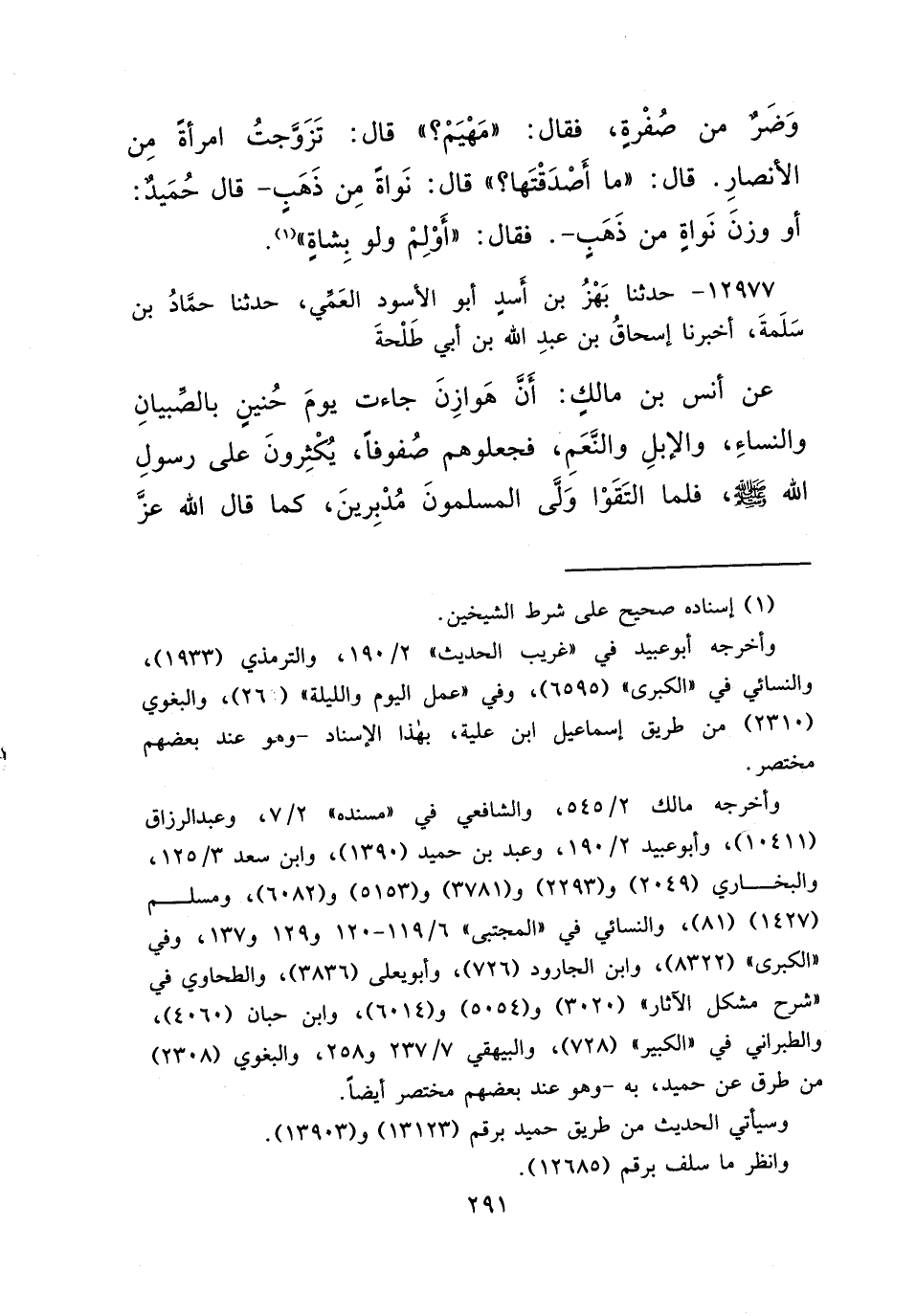 ١٢٩٧٧ - حَدَّثَنَا بَهْزُ بْنُ أَسَدٍ أَبُو الْأَسْوَدِ الْعَمِّيُّ، حَدَّثَنَا حَمَّادُ بْنُ سَلَمَةَ، أَخْبَرَنَا إِسْحَاقُ بْنُ عَبْدِ اللهِ بْنِ أَبِي طَلْحَةَ، عَنْ أَنَسِ بْنِ مَالِكٍ، أَنَّ هَوَازِنَ جَاءَتْ يَوْمَ حُنَيْنٍ بِالصِّبْيَانِ وَالنِّسَاءِ وَالْإِبِلِ وَالنَّعَمِ، فَجَعَلُوهُمْ صُفُوفًا يُكَثِّرُونَ عَلَى رَسُولِ اللهِ صَلَّى اللهُ عَلَيْهِ وَسَلَّمَ، فَلَمَّا الْتَقَوْا وَلَّى الْمُسْلِمُونَ مُدْبِرِينَ، كَمَا قَالَ اللهُ عَزَّ