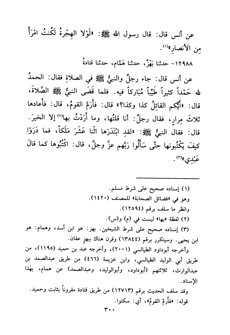 ١٢٩٨٨ - حَدَّثَنَا بَهْزٌ، حَدَّثَنَا هَمَّامٌ، حَدَّثَنَا قَتَادَةُ، عَنْ أَنَسٍ قَالَ: جَاءَ رَجُلٌ وَالنَّبِيُّ صَلَّى اللهُ عَلَيْهِ وَسَلَّمَ فِي الصَّلَاةِ، فَقَالَ: الْحَمْدُ لِلَّهِ حَمْدًا كَثِيرًا طَيِّبًا مُبَارَكًا فِيهِ، فَلَمَّا قَضَى النَّبِيُّ صَلَّى اللهُ عَلَيْهِ وَسَلَّمَ، الصَّلَاةَ قَالَ: " أَيُّكُمُ الْقَائِلُ كَذَا وَكَذَا؟ " قَالَ: فَأَرَمَّ الْقَوْمُ، قَالَ: فَأَعَادَهَا ثَلَاثَ مِرَارٍ، فَقَالَ رَجُلٌ: أَنَا قُلْتُهَا، وَمَا أَرَدْتُ بِهَا (٢) إِلَّا الْخَيْرَ، قَالَ: فَقَالَ النَّبِيُّ صَلَّى اللهُ عَلَيْهِ وَسَلَّمَ: " لَقَدِ ابْتَدَرَهَا اثْنَا عَشَرَ مَلَكًا، فَمَا دَرَوْا كَيْفَ يَكْتُبُونَهَا حَتَّى سَأَلُوا رَبَّهُمْ عَزَّ وَجَلَّ؟ " قَالَ: اكْتُبُوهَا كَمَا قَالَ عَبْدِي (٣)