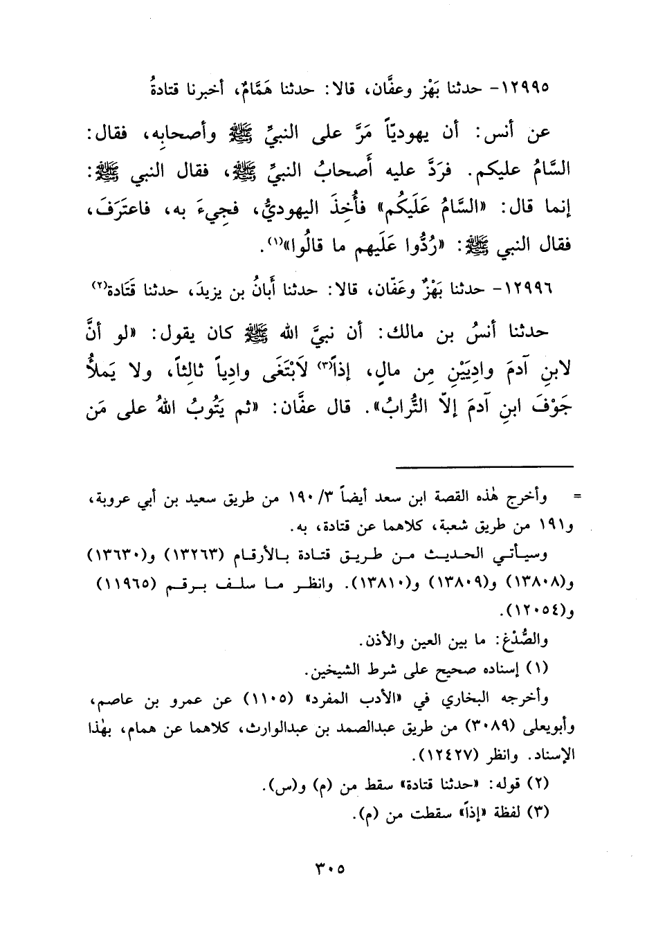١٢٩٩٥ - حَدَّثَنَا بَهْزٌ، وَعَفَّانُ، قَالَا: حَدَّثَنَا هَمَّامٌ، أَخْبَرَنَا قَتَادَةُ، عَنْ أَنَسٍ، أَنَّ يَهُودِيًّا مَرَّ عَلَى النَّبِيِّ صَلَّى اللهُ عَلَيْهِ وَسَلَّمَ وَأَصْحَابِهِ فَقَالَ: السَّامُ عَلَيْكُمْ، فَرَدَّ عَلَيْهِ أَصْحَابُ النَّبِيِّ صَلَّى اللهُ عَلَيْهِ وَسَلَّمَ، فَقَالَ النَّبِيُّ صَلَّى اللهُ عَلَيْهِ وَسَلَّمَ: " إِنَّمَا قَالَ: السَّامُ عَلَيْكُمْ "، فَأُخِذَ الْيَهُودِيُّ فَجِيءَ بِهِ فَاعْتَرَفَ، فَقَالَ النَّبِيُّ صَلَّى اللهُ عَلَيْهِ وَسَلَّمَ: " رُدُّوا عَلَيْهِمْ مَا قَالُوا " (١)