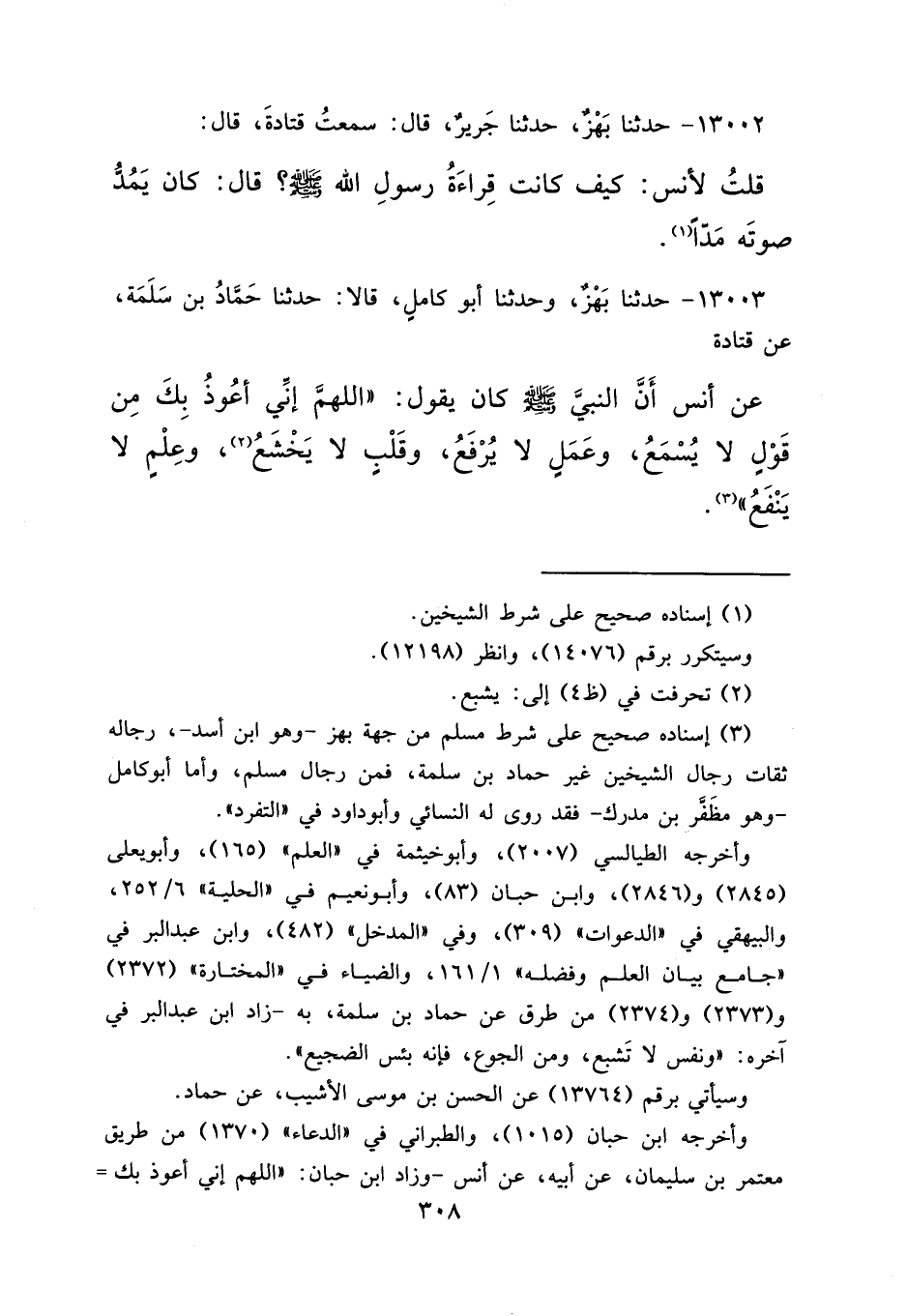 ١٣٠٠٣ - حَدَّثَنَا بَهْزٌ، وَحَدَّثَنَا أَبُو كَامِلٍ، قَالَا: حَدَّثَنَا حَمَّادُ بْنُ سَلَمَةَ، عَنْ قَتَادَةَ، عَنْ أَنَسٍ، أَنَّ النَّبِيَّ صَلَّى اللهُ عَلَيْهِ وَسَلَّمَ كَانَ يَقُولُ: " اللهُمَّ إِنِّي أَعُوذُ بِكَ مِنْ قَوْلٍ لَا يُسْمَعُ، وَعَمَلٍ لَا يُرْفَعُ، وَقَلْبٍ لَا يَخْشَعُ، (٢) وَعِلْمٍ لَا يَنْفَعُ " (٣)