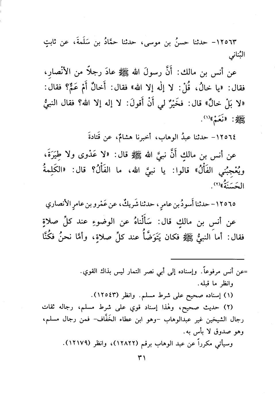 ١٢٥٦٣ - حَدَّثَنَا حَسَنُ بْنُ مُوسَى، حَدَّثَنَا حَمَّادُ بْنُ سَلَمَةَ، عَنْ ثَابِتٍ الْبُنَانِيِّ، عَنْ أَنَسِ بْنِ مَالِكٍ، أَنَّ رَسُولَ اللهِ صَلَّى اللهُ عَلَيْهِ وَسَلَّمَ عَادَ رَجُلًا مِنَ الْأَنْصَارِ فَقَالَ: " يَا خَالُ، قُلْ لَا إِلَهَ إِلَّا اللهُ " فَقَالَ: أَخَالٌ أَمْ عَمٌّ؟ فَقَالَ: " لَا، بَلْ خَالٌ "، قَالَ: فَخَيْرٌ لِي أَنْ أَقُولَ: لَا إِلَهَ إِلَّا اللهُ؟ فَقَالَ النَّبِيُّ صَلَّى اللهُ عَلَيْهِ وَسَلَّمَ: " نَعَمْ " (١)