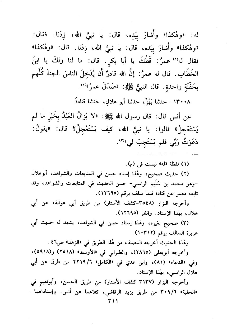 ١٣٠٠٨ - حَدَّثَنَا بَهْزٌ، حَدَّثَنَا أَبُو هِلَالٍ، حَدَّثَنَا قَتَادَةُ، عَنْ أَنَسٍ قَالَ: قَالَ رَسُولُ اللهِ صَلَّى اللهُ عَلَيْهِ وَسَلَّمَ: " لَا يَزَالُ الْعَبْدُ بِخَيْرٍ مَا لَمْ يَسْتَعْجِلْ ". قَالُوا: يَا نَبِيَّ اللهِ، كَيْفَ يَسْتَعْجِلُ؟ قَالَ: " يَقُولُ دَعَوْتُ رَبِّي فَلَمْ يَسْتَجِبْ لِي " (٣)
