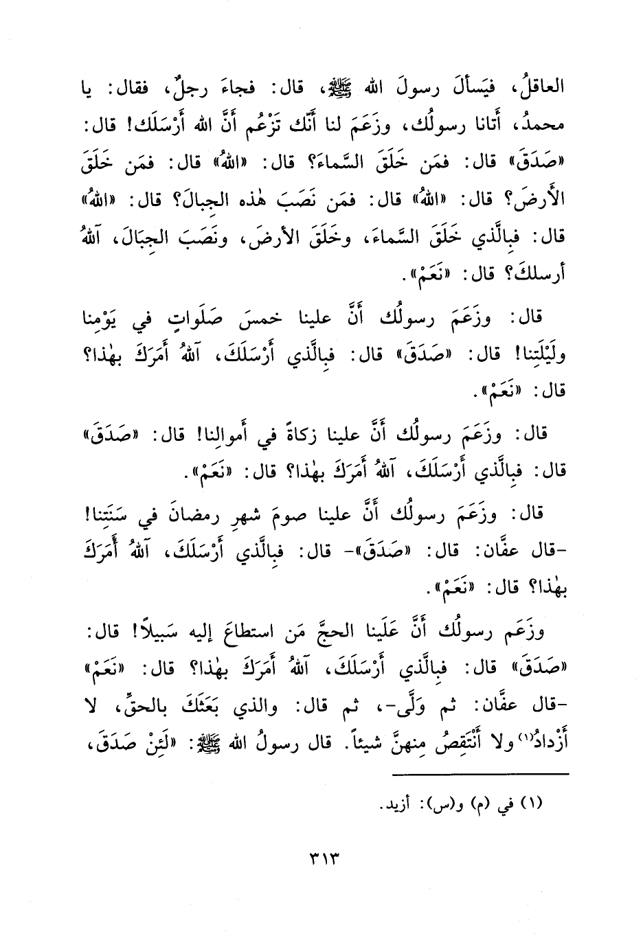 الْعَاقِلُ، يَسْأَلُ رَسُولَ اللهِ صَلَّى اللهُ عَلَيْهِ وَسَلَّمَ، قَالَ: فَجَاءَ رَجُلٌ فَقَالَ: يَا مُحَمَّدُ، أَتَانَا رَسُولُكَ، وَزَعَمَ لَنَا أَنَّكَ تَزْعُمُ أَنَّ اللهَ أَرْسَلَكَ، قَالَ: " صَدَقَ ". قَالَ: فَمَنْ خَلَقَ السَّمَاءَ؟ قَالَ: " اللهُ ". قَالَ: فَمَنْ خَلَقَ الْأَرْضَ؟ قَالَ: " اللهُ ". قَالَ: فَمَنْ نَصَبَ هَذِهِ الْجِبَالَ؟ قَالَ: " اللهُ ". قَالَ: فَبِالَّذِي خَلَقَ السَّمَاءَ، وَخَلَقَ الْأَرْضَ، وَنَصَبَ الْجِبَالَ، آللَّهُ أَرْسَلَكَ؟ قَالَ: " نَعَمْ ". قَالَ: وَزَعَمَ رَسُولُكَ أَنَّ عَلَيْنَا خَمْسَ صَلَوَاتٍ فِي يَوْمِنَا وَلَيْلَتِنَا، قَالَ: " صَدَقَ ". قَالَ: فَبِالَّذِي أَرْسَلَكَ، آللَّهُ أَمَرَكَ بِهَذَا؟ قَالَ: " نَعَمْ ". قَالَ: وَزَعَمَ رَسُولُكَ أَنَّ عَلَيْنَا زَكَاةً فِي أَمْوَالِنَا، قَالَ: " صَدَقَ ". قَالَ: فَبِالَّذِي أَرْسَلَكَ، آللَّهُ أَمَرَكَ بِهَذَا؟ قَالَ: " نَعَمْ ". قَالَ: وَزَعَمَ رَسُولُكَ أَنَّ عَلَيْنَا صَوْمَ شَهْرِ رَمَضَانَ فِي سَنَتِنَا، قَالَ عَفَّانُ: قَالَ: " صَدَقَ ". قَالَ: فَبِالَّذِي أَرْسَلَكَ، آللَّهُ أَمَرَكَ بِهَذَا؟ قَالَ: " نَعَمْ ". وَزَعَمَ رَسُولُكَ أَنَّ عَلَيْنَا الْحَجَّ مَنْ اسْتَطَاعَ إِلَيْهِ سَبِيلًا، قَالَ: " صَدَقَ ". قَالَ: فَبِالَّذِي أَرْسَلَكَ، آللَّهُ أَمَرَكَ بِهَذَا؟ قَالَ: " نَعَمْ ". قَالَ عَفَّانُ:، ثُمَّ وَلَّى، ثُمَّ قَالَ: وَالَّذِي بَعَثَكَ بِالْحَقِّ، لَا أَزْدَادُ (١) وَلَا أَنْتَقِصُ مِنْهُنَّ شَيْئًا، قَالَ رَسُولُ اللهِ صَلَّى اللهُ عَلَيْهِ وَسَلَّمَ: " لَئِنْ صَدَقَ