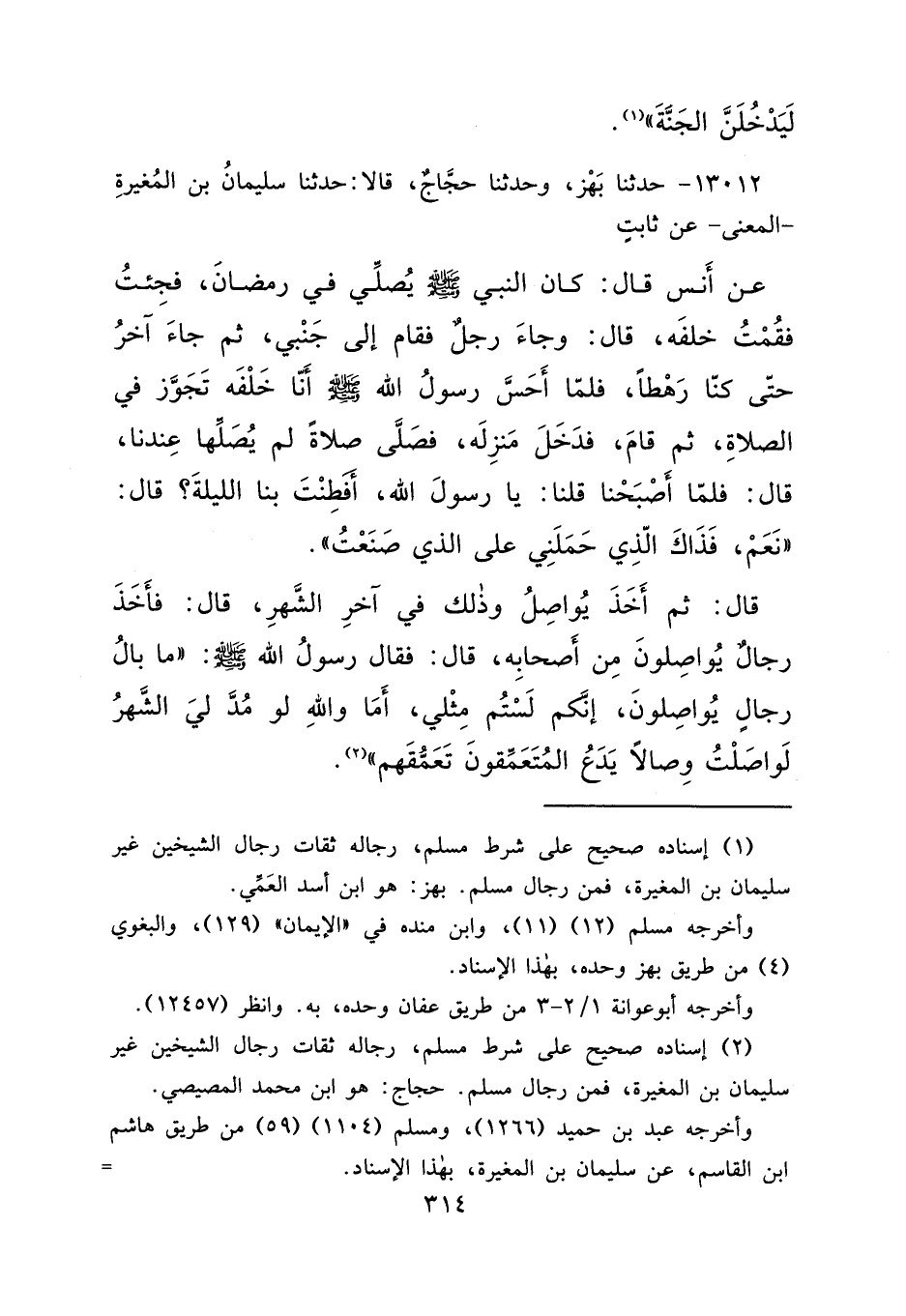١٣٠١٢ - حَدَّثَنَا بَهْزٌ، وَحَدَّثَنَا حَجَّاجٌ، قَالَا: حَدَّثَنَا سُلَيْمَانُ بْنُ الْمُغِيرَةِ الْمَعْنَى، عَنْ ثَابِتٍ، عَنْ أَنَسٍ قَالَ: كَانَ النَّبِيُّ صَلَّى اللهُ عَلَيْهِ وَسَلَّمَ يُصَلِّي فِي رَمَضَانَ، فَجِئْتُ فَقُمْتُ خَلْفَهُ، قَالَ: وَجَاءَ رَجُلٌ فَقَامَ إِلَى جَنْبِي، ثُمَّ جَاءَ آخَرُ حَتَّى كُنَّا رَهْطًا، فَلَمَّا أَحَسَّ رَسُولُ اللهِ صَلَّى اللهُ عَلَيْهِ وَسَلَّمَ، أَنَّا خَلْفَهُ تَجَوَّزَ فِي الصَّلَاةِ، ثُمَّ قَامَ فَدَخَلَ مَنْزِلَهُ فَصَلَّى صَلَاةً لَمْ يُصَلِّهَا عِنْدَنَا، قَالَ: فَلَمَّا أَصْبَحْنَا قُلْنَا: يَا رَسُولَ اللهِ، أَفَطِنْتَ بِنَا اللَّيْلَةَ؟ قَالَ: " نَعَمْ، فَذَاكَ الَّذِي حَمَلَنِي عَلَى الَّذِي صَنَعْتُ " قَالَ: ثُمَّ أَخَذَ يُوَاصِلُ وَذَاكَ فِي آخِرِ الشَّهْرِ، قَالَ: فَأَخَذَ رِجَالٌ يُوَاصِلُونَ مِنْ أَصْحَابِهِ قَالَ: فَقَالَ رَسُولُ اللهِ صَلَّى اللهُ عَلَيْهِ وَسَلَّمَ: " مَا بَالُ رِجَالٍ يُوَاصِلُونَ، إِنَّكُمْ لَسْتُمْ مِثْلِي، أَمَا وَاللهِ لَوْ مُدَّ لِي الشَّهْرُ لَوَاصَلْتُ وِصَالًا يَدَعُ الْمُتَعَمِّقُونَ تَعَمُّقَهُمْ " (٢)