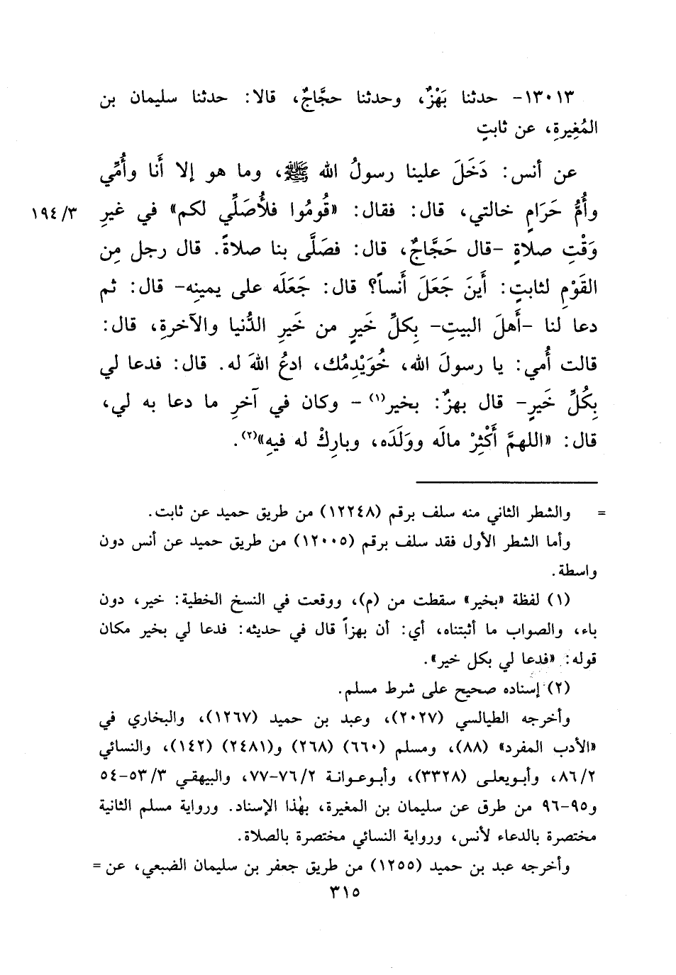 ١٣٠١٣ - حَدَّثَنَا بَهْزٌ، وَحَدَّثَنَا حَجَّاجٌ، قَالَا: حَدَّثَنَا سُلَيْمَانُ بْنُ الْمُغِيرَةِ، عَنْ ثَابِتٍ، عَنْ أَنَسٍ، دَخَلَ عَلَيْنَا رَسُولُ اللهِ صَلَّى اللهُ عَلَيْهِ وَسَلَّمَ وَمَا هُوَ إِلَّا أَنَا وَأُمِّي وَأُمُّ حَرَامٍ خَالَتِي، قَالَ: فَقَالَ: " قُومُوا فَلِأُصَلِّي لَكُمْ " فِي غَيْرِ وَقْتِ صَلَاةٍ. قَالَ حَجَّاجٌ: قَالَ: فَصَلَّى بِنَا صَلَاةً، قَالَ رَجُلٌ مِنَ الْقَوْمِ لِثَابِتٍ: أَيْنَ جَعَلَ أَنَسًا؟ قَالَ: جَعَلَهُ عَلَى يَمِينِهِ، قَالَ: ثُمَّ دَعَا لَنَا أَهْلَ الْبَيْتِ بِكُلِّ خَيْرٍ مِنْ خَيْرِ الدُّنْيَا وَالْآخِرَةِ، قَالَ: قَالَتْ أُمِّي: يَا رَسُولَ اللهِ، خُوَيْدِمُكَ ادْعُ اللهَ لَهُ، قَالَ: فَدَعَا لِي بِكُلِّ خَيْرٍ، قَالَ بَهْزٌ بِخَيْرٍ (١) وَكَانَ فِي آخِرِ مَا دَعَا بِهِ لِي، قَالَ: " اللهُمَّ أَكْثِرْ مَالَهُ وَوَلَدَهُ وَبَارِكْ لَهُ فِيهِ " (٢)