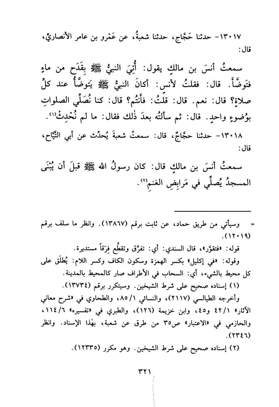 ١٣٠١٧ - حَدَّثَنَا حَجَّاجٌ، حَدَّثَنَا شُعْبَةُ، عَنْ عَمْرِو بْنِ عَامِرٍ الْأَنْصَارِيِّ، قَالَ: سَمِعْتُ أَنَسَ بْنَ مَالِكٍ يَقُولُ: " أُتِيَ النَّبِيُّ صَلَّى اللهُ عَلَيْهِ وَسَلَّمَ بِقَدَحٍ مِنْ مَاءٍ فَتَوَضَّأَ "، قَالَ: فَقُلْتُ لِأَنَسٍ: أَكَانَ النَّبِيُّ صَلَّى اللهُ عَلَيْهِ وَسَلَّمَ يَتَوَضَّأُ عِنْدَ كُلِّ صَلَاةٍ؟ قَالَ: " نَعَمْ "، قَالَ: قُلْتُ: فَأَنْتُمْ؟ قَالَ: " كُنَّا نُصَلِّي الصَّلَوَاتِ بِوُضُوءٍ وَاحِدٍ " قَالَ: ثُمَّ سَأَلْتُهُ بَعْدَ ذَلِكَ، فَقَالَ: " مَا لَمْ نُحْدِثْ " (١)