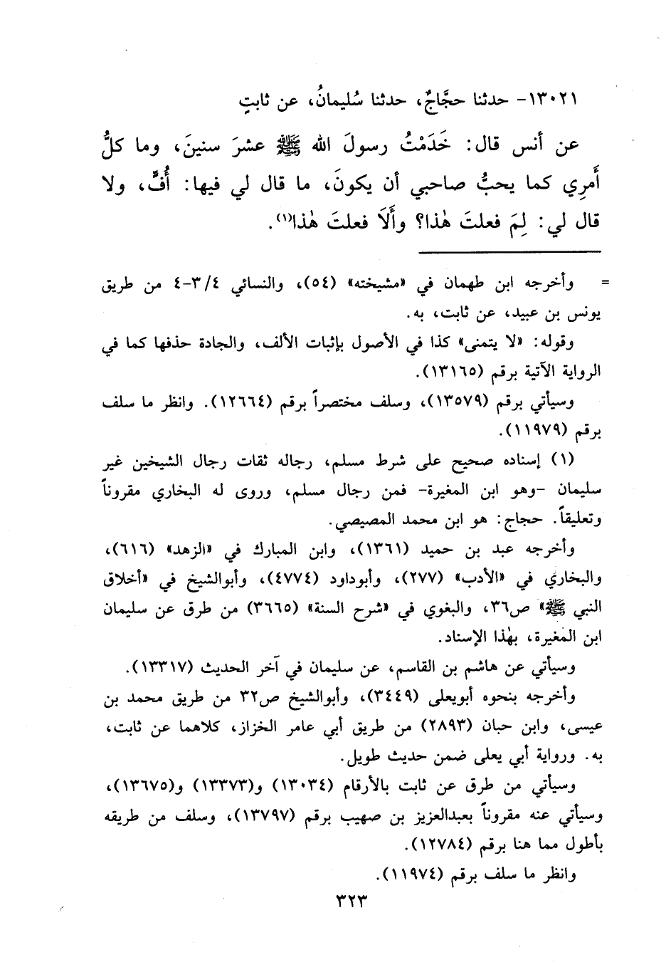 ١٣٠٢١ - حَدَّثَنَا حَجَّاجٌ، حَدَّثَنَا سُلَيْمَانُ، عَنْ ثَابِتٍ، عَنْ أَنَسٍ قَالَ: " خَدَمْتُ رَسُولَ اللهِ صَلَّى اللهُ عَلَيْهِ وَسَلَّمَ عَشْرَ سِنِينَ، وَمَا كُلُّ أَمْرِي كَمَا يُحِبُّ صَاحِبِي أَنْ يَكُونَ، مَا قَالَ لِي فِيهَا: أُفٍّ، وَلَا قَالَ لِي: لِمَ فَعَلْتَ هَذَا، وَأَلَّا فَعَلْتَ هَذَا " (١)