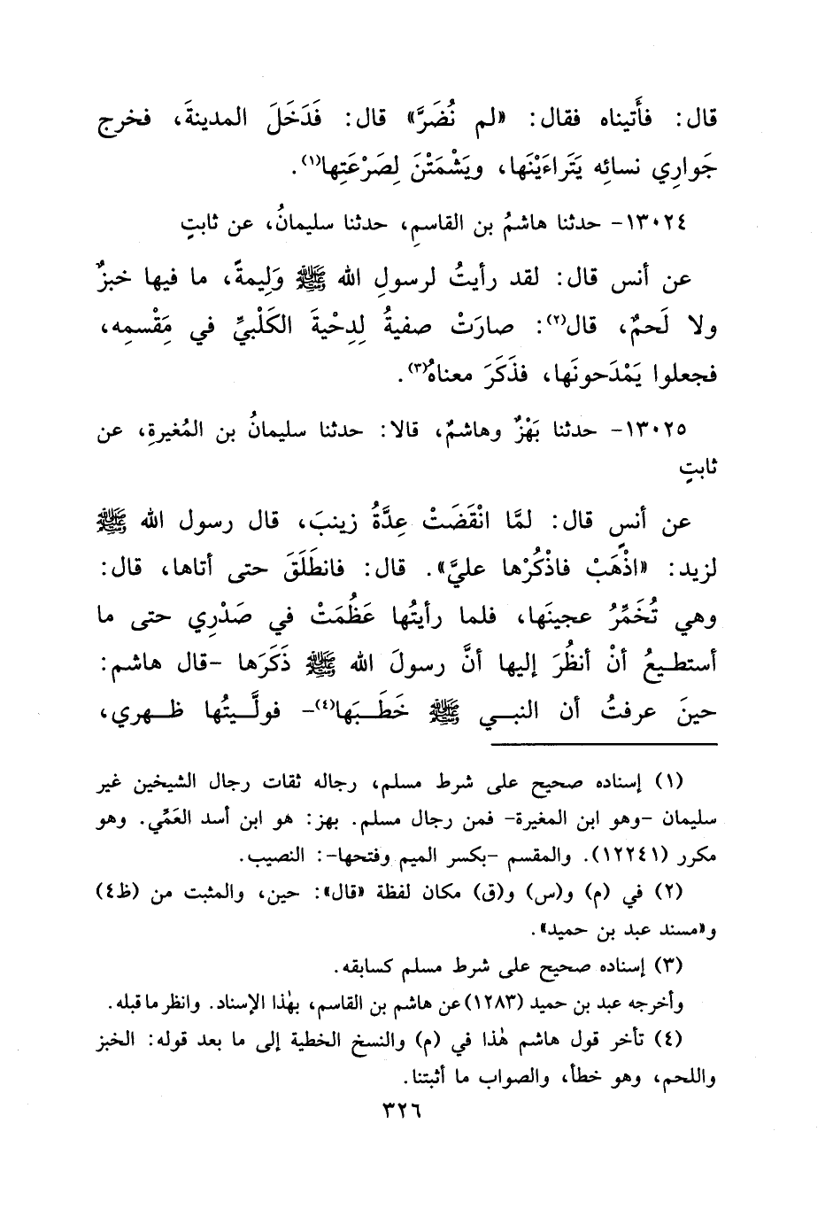 ١٣٠٢٤ - حَدَّثَنَا هَاشِمُ بْنُ الْقَاسِمِ، حَدَّثَنَا سُلَيْمَانُ، عَنْ ثَابِتٍ، عَنْ أَنَسٍ قَالَ: لَقَدْ رَأَيْتُ لِرَسُولِ اللهِ صَلَّى اللهُ عَلَيْهِ وَسَلَّمَ وَلِيمَةً مَا فِيهَا خُبْزٌ وَلَا لَحْمٌ، قَالَ: (٢) صَارَتْ صَفِيَّةُ لِدِحْيَةَ الْكَلْبِيِّ فِي مَقْسَمِهِ، فَجَعَلُوا يَمْدَحُونَهَا، فَذَكَرَ مَعْنَاهُ (٣)