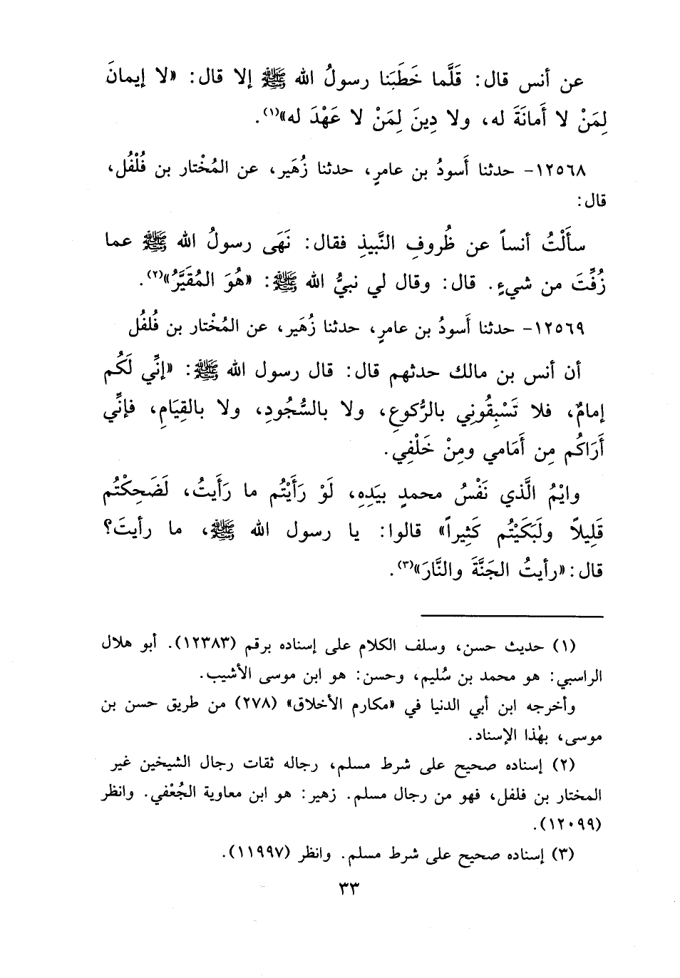 ١٢٥٦٩ - حَدَّثَنَا أَسْوَدُ بْنُ عَامِرٍ، حَدَّثَنَا زُهَيْرٌ، عَنِ الْمُخْتَارِ بْنِ فُلْفُلٍ، أَنَّ أَنَسَ بْنَ مَالِكٍ حَدَّثَهُمْ قَالَ: قَالَ رَسُولُ اللهِ صَلَّى اللهُ عَلَيْهِ وَسَلَّمَ: " إِنِّي لَكُمْ إِمَامٌ، فَلَا تَسْبِقُونِي بِالرُّكُوعِ، وَلَا بِالسُّجُودِ، وَلَا بِالْقِيَامِ، فَإِنِّي أَرَاكُمْ مِنْ أَمَامِي وَمِنْ خَلْفِي، وَايْمُ الَّذِي نَفْسُ مُحَمَّدٍ بِيَدِهِ، لَوْ رَأَيْتُمْ مَا رَأَيْتُ لَضَحِكْتُمْ قَلِيلًا وَلَبَكَيْتُمْ كَثِيرًا "، قَالُوا: يَا رَسُولَ اللهِ صَلَّى اللهُ عَلَيْهِ وَسَلَّمَ مَا رَأَيْتَ؟ قَالَ: " رَأَيْتُ الْجَنَّةَ وَالنَّارَ " (٣)