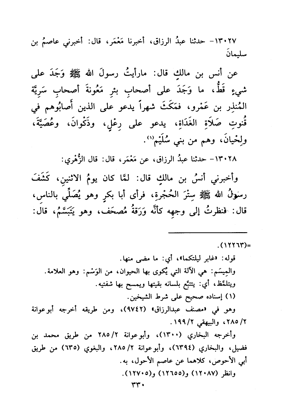 ١٣٠٢٧ - حَدَّثَنَا عَبْدُ الرَّزَّاقِ، أَخْبَرَنَا مَعْمَرٌ، قَالَ: أَخْبَرَنِي عَاصِمُ بْنُ سُلَيْمَانَ، عَنْ أَنَسِ بْنِ مَالِكٍ قَالَ: " مَا رَأَيْتُ رَسُولَ اللهِ صَلَّى اللهُ عَلَيْهِ وَسَلَّمَ وَجَدَ عَلَى شَيْءٍ قَطُّ مَا وَجَدَ عَلَى أَصْحَابِ بِئْرِ مَعُونَةَ، أَصْحَابِ سَرِيَّةِ الْمُنْذِرِ بْنِ عَمْرٍو، فَمَكَثَ شَهْرًا يَدْعُو عَلَى الَّذِينَ أَصَابُوهُمْ فِي قُنُوتِ صَلَاةِ الْغَدَاةِ، يَدْعُو عَلَى رِعْلٍ، وَذَكْوَانَ، وَعُصَيَّةَ، وَلِحْيَانَ، وَهُمْ مِنْ بَنِي سُلَيْمٍ " (١)