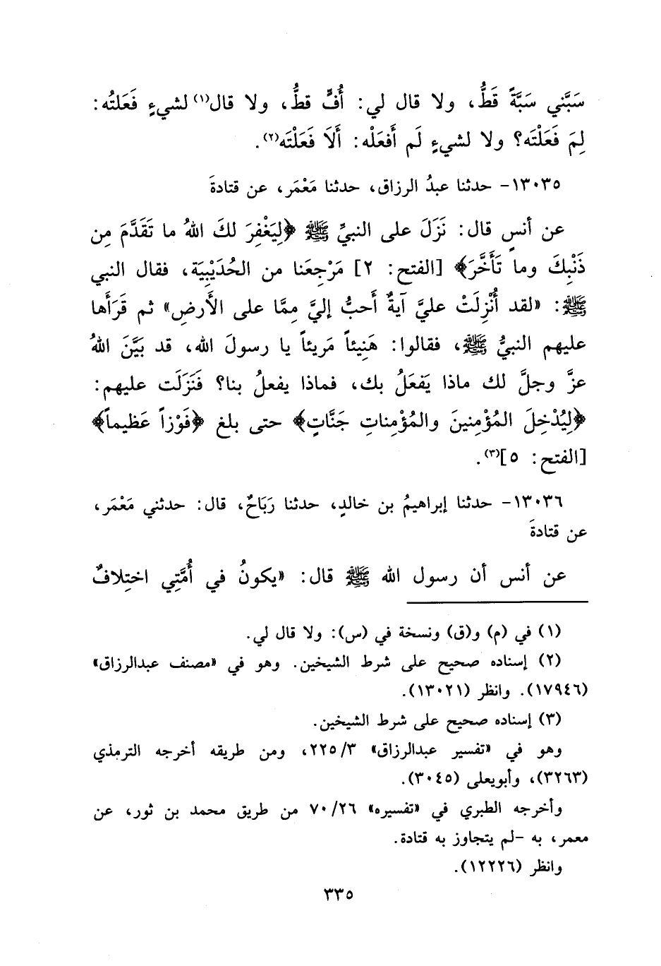 ١٣٠٣٥ - حَدَّثَنَا عَبْدُ الرَّزَّاقِ، حَدَّثَنَا مَعْمَرٌ، عَنْ قَتَادَةَ، عَنْ أَنَسٍ قَالَ: نَزَلَ عَلَى النَّبِيِّ صَلَّى اللهُ عَلَيْهِ وَسَلَّمَ: {لِيَغْفِرَ لَكَ اللهُ مَا تَقَدَّمَ مِنْ ذَنْبِكَ وَمَا تَأَخَّرَ} [الفتح: ٢] مَرْجِعَنَا مِنَ الْحُدَيْبِيَةِ، فَقَالَ النَّبِيُّ صَلَّى اللهُ عَلَيْهِ وَسَلَّمَ: " لَقَدْ أُنْزِلَتْ عَلَيَّ آيَةٌ أَحَبُّ إِلَيَّ مِمَّا عَلَى الْأَرْضِ "، ثُمَّ قَرَأَهَا عَلَيْهِمُ النَّبِيُّ صَلَّى اللهُ عَلَيْهِ وَسَلَّمَ، فَقَالُوا: هَنِيئًا مَرِيئًا يَا رَسُولَ اللهِ، لَقَدْ بَيَّنَ اللهُ عَزَّ وَجَلَّ لَكَ مَاذَا يَفْعَلُ بِكَ، فَمَاذَا يَفْعَلُ بِنَا؟ فَنَزَلَتْ عَلَيْهِمْ: {لِيُدْخِلَ الْمُؤْمِنِينَ وَالْمُؤْمِنَاتِ جَنَّاتٍ} [الفتح: ٥] (٣) حَتَّى بَلَغَ {فَوْزًا عَظِيمًا} [النساء: ٧٣]