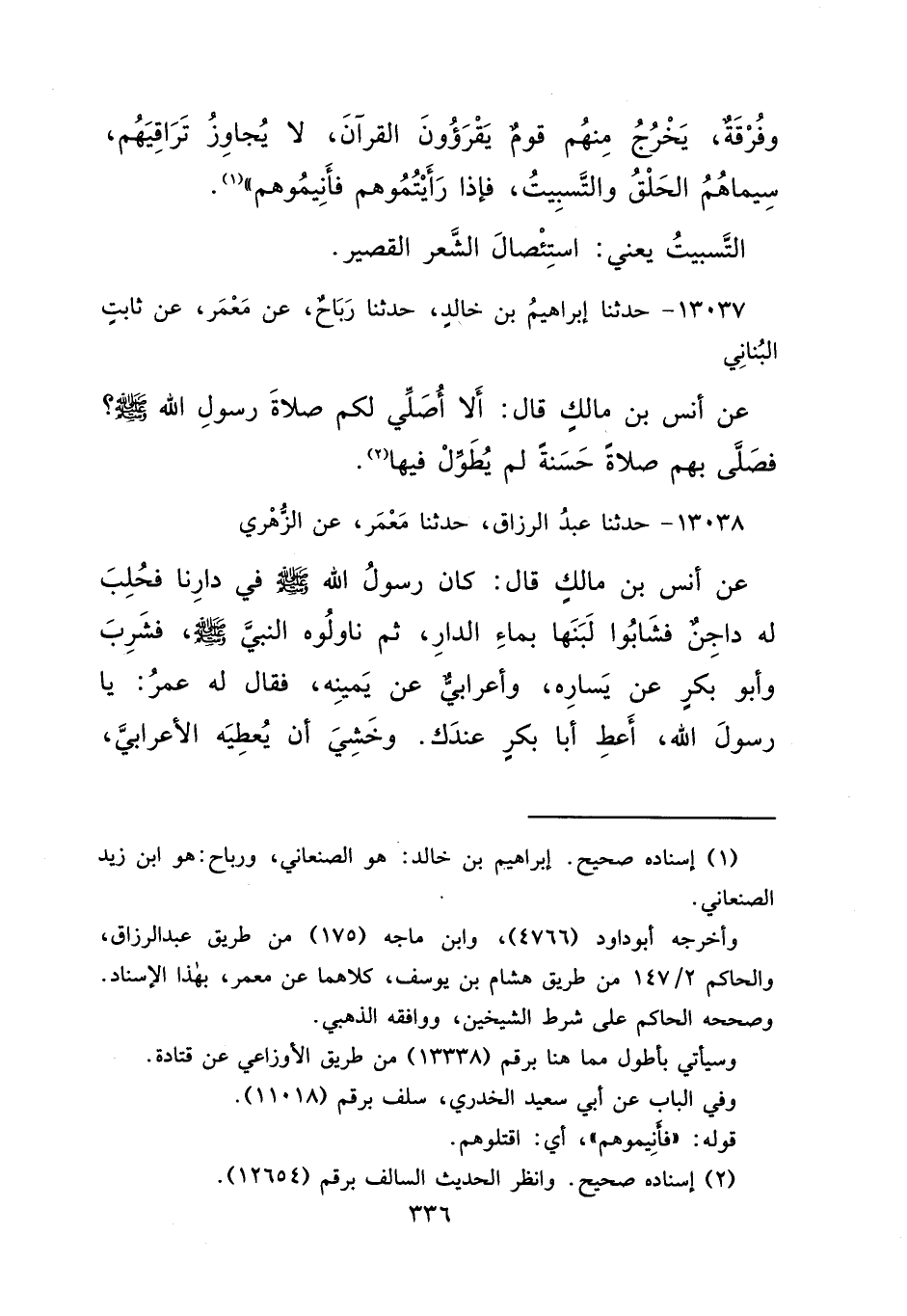 وَفُرْقَةٌ، يَخْرُجُ مِنْهُمْ قَوْمٌ يَقْرَءُونَ الْقُرْآنَ، لَا يُجَاوِزُ تَرَاقِيَهُمْ، سِيمَاهُمُ الْحَلْقُ وَالتَّسْبِيتُ، فَإِذَا رَأَيْتُمُوهُمْ فَأَنِيمُوهُمْ " (١) التَّسْبِيتُ يَعْنِي: اسْتِئْصَالَ الشَّعْرِ الْقَصِيرِ
