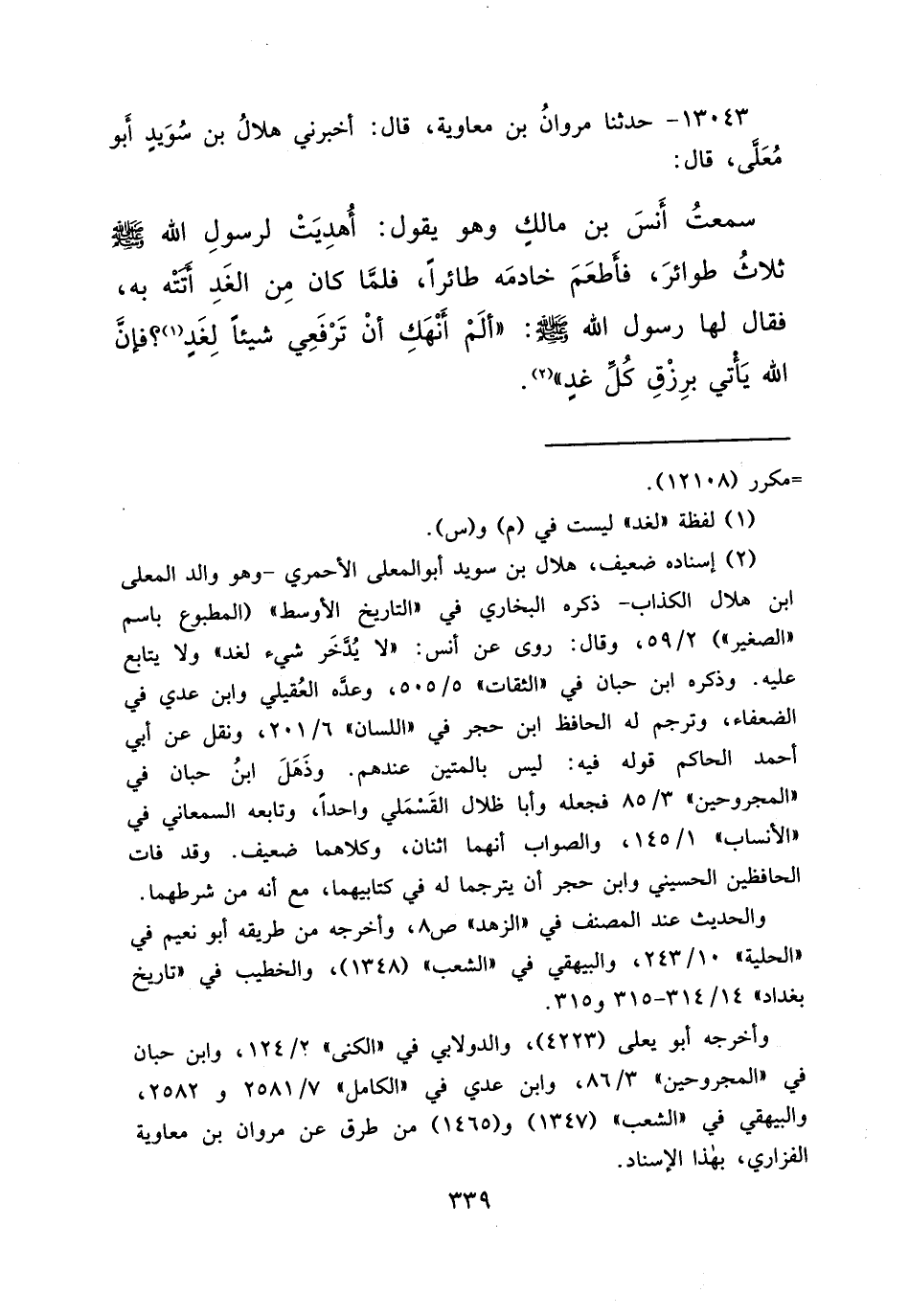 ١٣٠٤٣ - حَدَّثَنَا مَرْوَانُ بْنُ مُعَاوِيَةَ، قَالَ: أَخْبَرَنِي هِلَالُ بْنُ سُوَيْدٍ أَبُو مُعَلَّى، قَالَ: سَمِعْتُ أَنَسَ بْنَ مَالِكٍ وَهُوَ يَقُولُ: أُهْدِيَتْ لِرَسُولِ اللهِ صَلَّى اللهُ عَلَيْهِ وَسَلَّمَ ثَلَاثَةُ طَوَائِرَ، فَأَطْعَمَ خَادِمَهُ طَائِرًا، فَلَمَّا كَانَ مِنَ الْغَدِ أَتَتْهُ بِهِ، فَقَالَ لَهَا رَسُولُ اللهِ صَلَّى اللهُ عَلَيْهِ وَسَلَّمَ: " أَلَمْ أَنْهَكِ أَنْ تَرْفَعِي شَيْئًا لِغَدٍ، (١) فَإِنَّ اللهَ يَأْتِي بِرِزْقِ كُلِّ غَدٍ " (٢)
