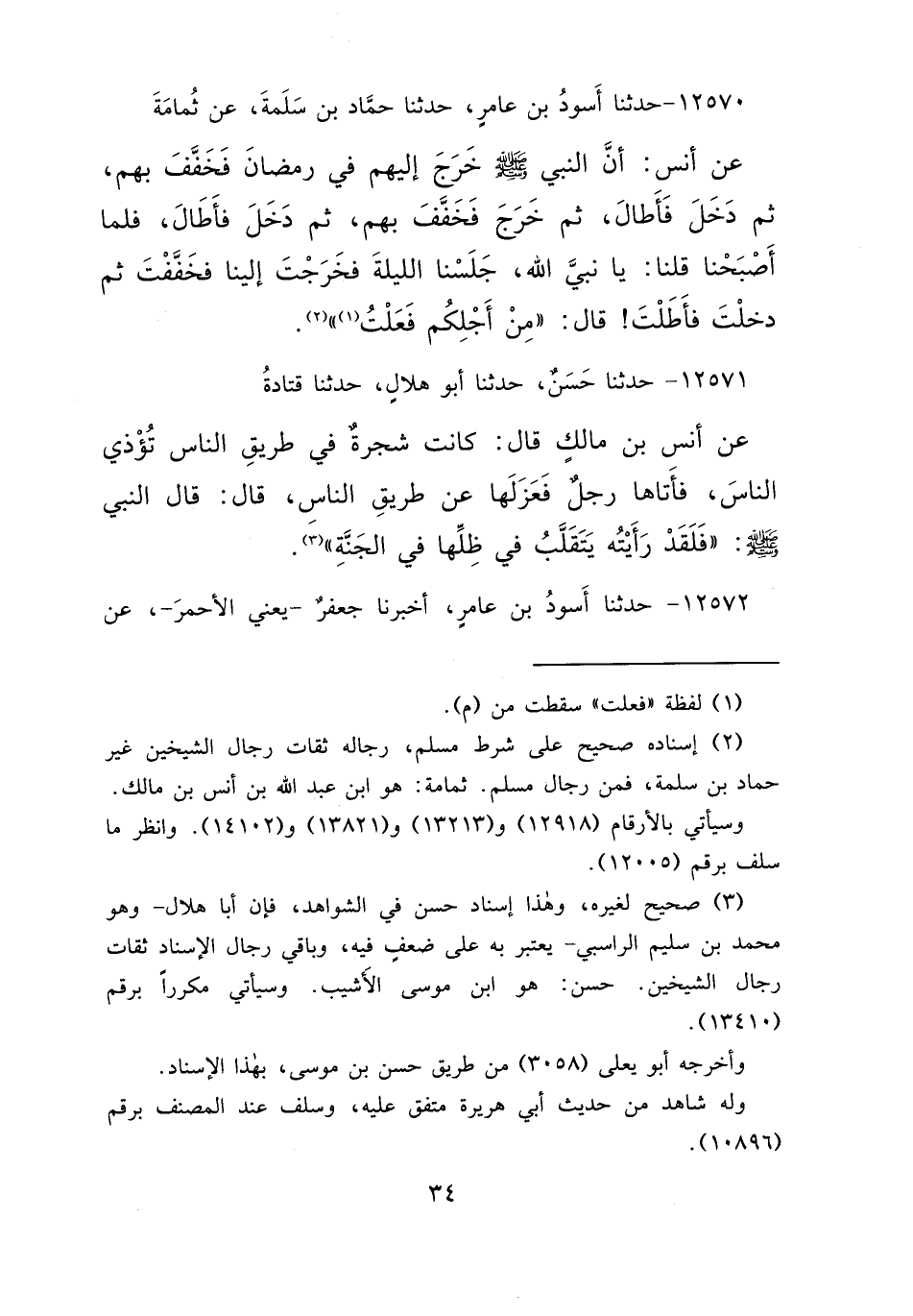 ١٢٥٧١ - حَدَّثَنَا حَسَنٌ، حَدَّثَنَا أَبُو هِلَالٍ، حَدَّثَنَا قَتَادَةُ، عَنْ أَنَسِ بْنِ مَالِكٍ قَالَ: كَانَتْ شَجَرَةٌ فِي طَرِيقِ النَّاسِ تُؤْذِي النَّاسَ، فَأَتَاهَا رَجُلٌ فَعَزَلَهَا عَنْ طَرِيقِ النَّاسِ، قَالَ: قَالَ النَّبِيُّ صَلَّى اللهُ عَلَيْهِ وَسَلَّمَ: " فَلَقَدْ رَأَيْتُهُ يَتَقَلَّبُ فِي ظِلِّهَا فِي الْجَنَّةِ " (٣)