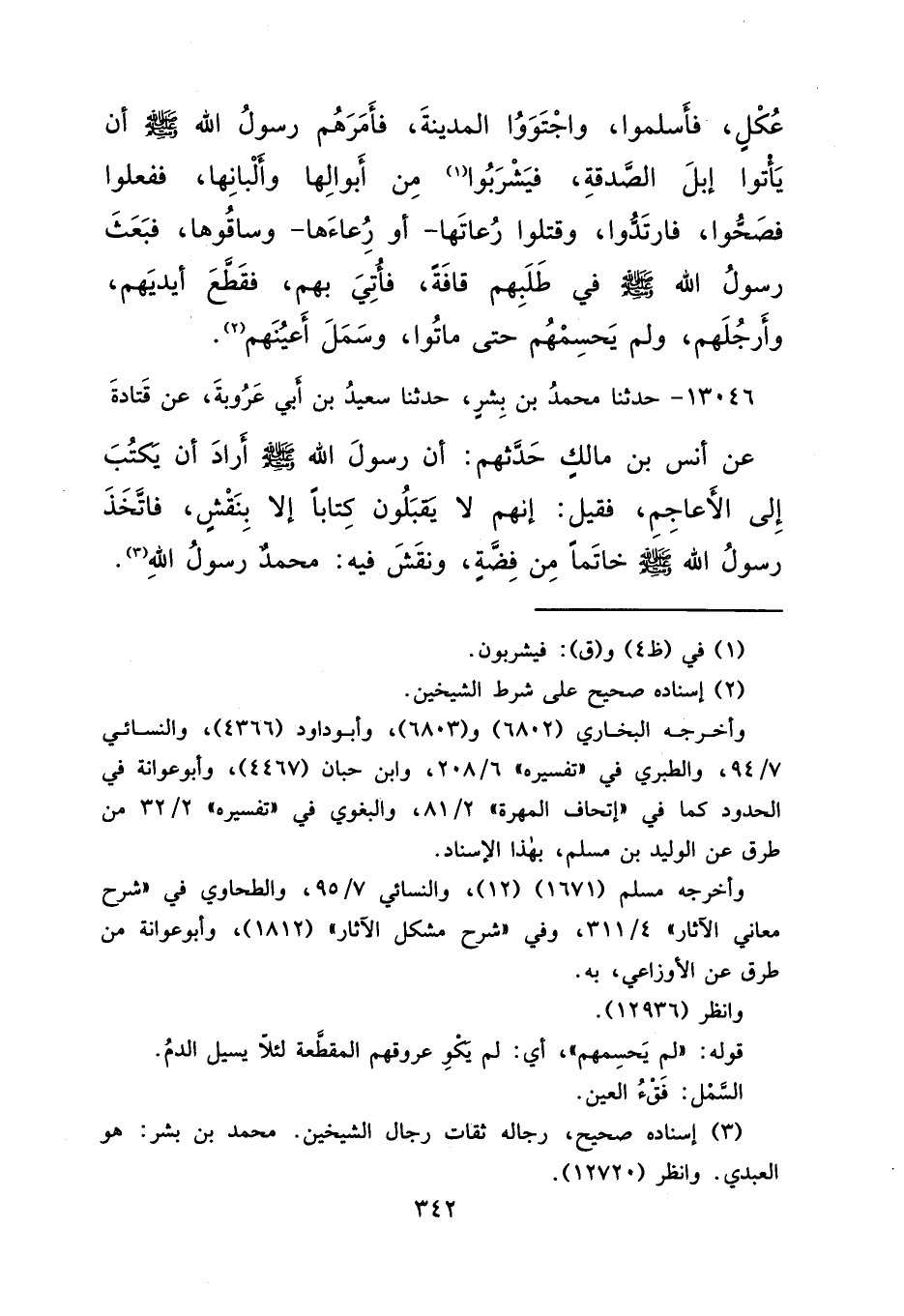 ١٣٠٤٦ - حَدَّثَنَا مُحَمَّدُ بْنُ بِشْرٍ، حَدَّثَنَا سَعِيدُ بْنُ أَبِي عَرُوبَةَ، عَنْ قَتَادَةَ، عَنْ أَنَسِ بْنِ مَالِكٍ حَدَّثَهُمْ " أَنَّ رَسُولَ اللهِ صَلَّى اللهُ عَلَيْهِ وَسَلَّمَ أَرَادَ أَنْ يَكْتُبَ إِلَى الْأَعَاجِمِ، فَقِيلَ: إِنَّهُمْ لَا يَقْبَلُونَ كِتَابًا إِلَّا بِنَقْشٍ فَاتَّخَذَ رَسُولُ اللهِ صَلَّى اللهُ عَلَيْهِ وَسَلَّمَ خَاتَمًا مِنْ فِضَّةٍ، وَنَقَشَ فِيهِ مُحَمَّدٌ رَسُولُ اللهِ " (٣)