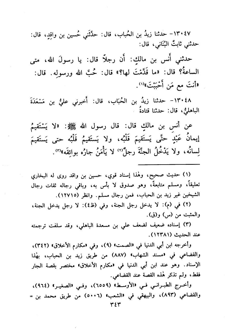 ١٣٠٤٨ - حَدَّثَنَا زَيْدُ بْنُ الْحُبَابِ، قَالَ: أَخْبَرَنِي عَلِيُّ بْنُ مَسْعَدَةَ الْبَاهِلِيُّ، قَالَ: حَدَّثَنَا قَتَادَةُ، عَنْ أَنَسِ بْنِ مَالِكٍ قَالَ: قَالَ رَسُولُ اللهِ صَلَّى اللهُ عَلَيْهِ وَسَلَّمَ: " لَا يَسْتَقِيمُ إِيمَانُ عَبْدٍ حَتَّى يَسْتَقِيمَ قَلْبُهُ، وَلَا يَسْتَقِيمُ قَلْبُهُ حَتَّى يَسْتَقِيمَ لِسَانُهُ، وَلَا يَدْخُلُ الْجَنَّةَ رَجُلٌ (٢) لَا يَأْمَنُ جَارُهُ بَوَائِقَهُ " (٣)