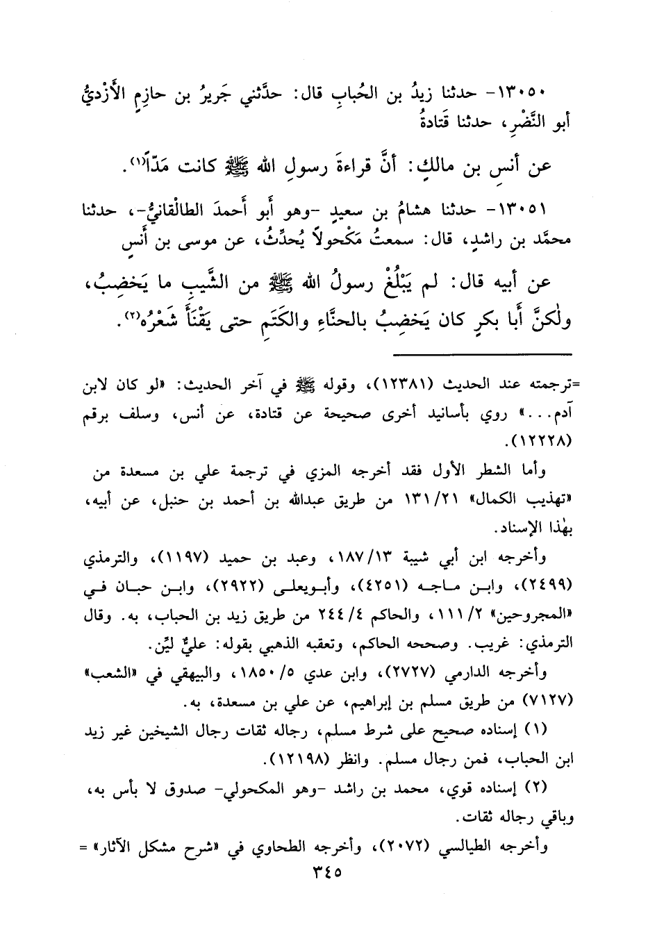 ١٣٠٥٠ - حَدَّثَنَا زَيْدُ بْنُ الْحُبَابِ، قَالَ: حَدَّثَنِي جَرِيرُ بْنُ حَازِمٍ الْأَزْدِيُّ أَبُو النَّضْرِ، حَدَّثَنَا قَتَادَةُ، عَنْ أَنَسِ بْنِ مَالِكٍ، " أَنَّ قِرَاءَةَ رَسُولِ اللهِ صَلَّى اللهُ عَلَيْهِ وَسَلَّمَ كَانَتْ مَدًّا " (١)