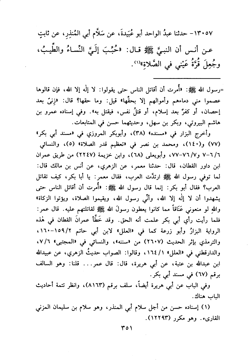 ١٣٠٥٧ - حَدَّثَنَا عَبْدُ الْوَاحِدِ أَبُو عُبَيْدَةَ، عَنْ سَلَّامٍ أَبِي الْمُنْذِرِ، عَنْ ثَابِتٍ، عَنْ أَنَسٍ، أَنَّ النَّبِيَّ صَلَّى اللهُ عَلَيْهِ وَسَلَّمَ قَالَ: " حُبِّبَ إِلَيَّ النِّسَاءُ وَالطِّيبُ، وَجُعِلَ قُرَّةُ عَيْنِي فِي الصَّلَاةِ " (١)