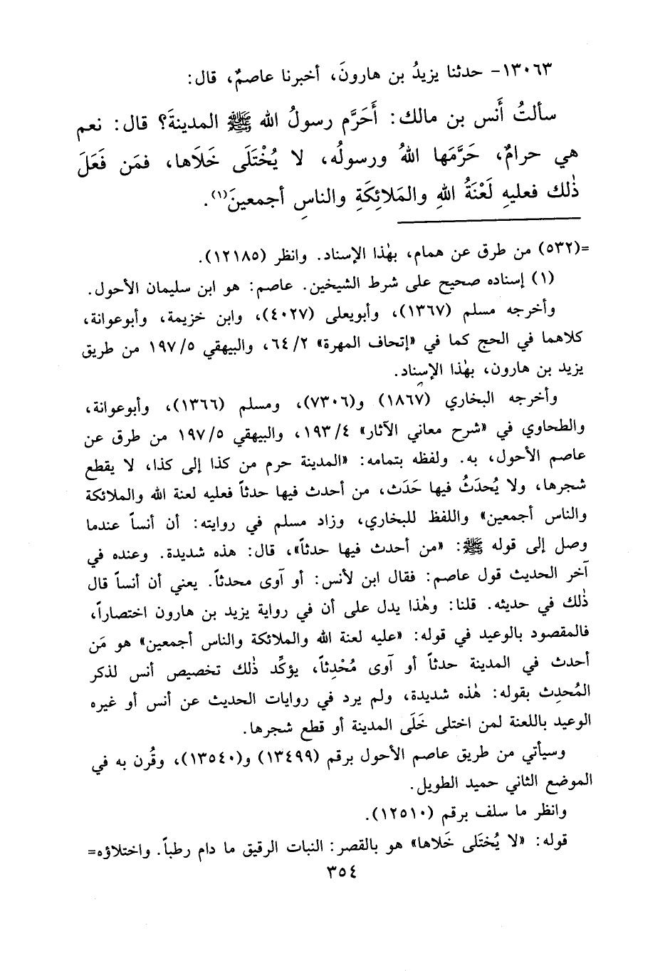 ١٣٠٦٣ - حَدَّثَنَا يَزِيدُ بْنُ هَارُونَ، أَخْبَرَنَا عَاصِمٌ، قَالَ: سَأَلْتُ أَنَسَ بْنَ مَالِكٍ، أَحَرَّمَ رَسُولُ اللهِ صَلَّى اللهُ عَلَيْهِ وَسَلَّمَ الْمَدِينَةَ؟ قَالَ: " نَعَمْ هِيَ حَرَامٌ، حَرَّمَهَا اللهُ وَرَسُولُهُ لَا يُخْتَلَى خَلَاهَا، فَمَنْ فَعَلَ ذَلِكَ فَعَلَيْهِ لَعْنَةُ اللهِ، وَالْمَلَائِكَةِ، وَالنَّاسِ أَجْمَعِينَ " (١)