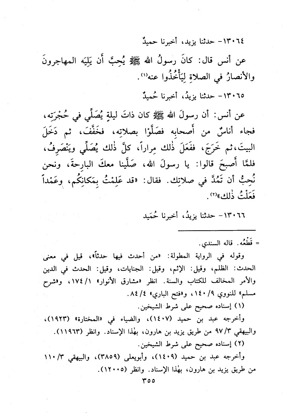 ١٣٠٦٥ - حَدَّثَنَا يَزِيدُ، أَخْبَرَنَا حُمَيْدٌ، عَنْ أَنَسٍ، أَنَّ رَسُولَ اللهِ صَلَّى اللهُ عَلَيْهِ وَسَلَّمَ كَانَ ذَاتَ لَيْلَةٍ يُصَلِّي فِي حُجْرَتِهِ، فَجَاءَ أُنَاسٌ مِنْ أَصْحَابِهِ فَصَلَّوْا بِصَلَاتِهِ فَخَفَّفَ، ثُمَّ دَخَلَ الْبَيْتَ، ثُمَّ خَرَجَ فَفَعَلَ ذَلِكَ مِرَارًا، كُلُّ ذَلِكَ يُصَلِّي وَيَنْصَرِفُ، فَلَمَّا أَصْبَحَ قَالُوا: يَا رَسُولَ اللهِ، صَلَّيْنَا مَعَكَ الْبَارِحَةَ وَنَحْنُ نُحِبُّ أَنْ تَمُدَّ فِي صَلَاتِكَ، فَقَالَ: " قَدْ عَلِمْتُ بِمَكَانِكُمْ، وَعَمْدًا فَعَلْتُ ذَلِكَ " (٢)